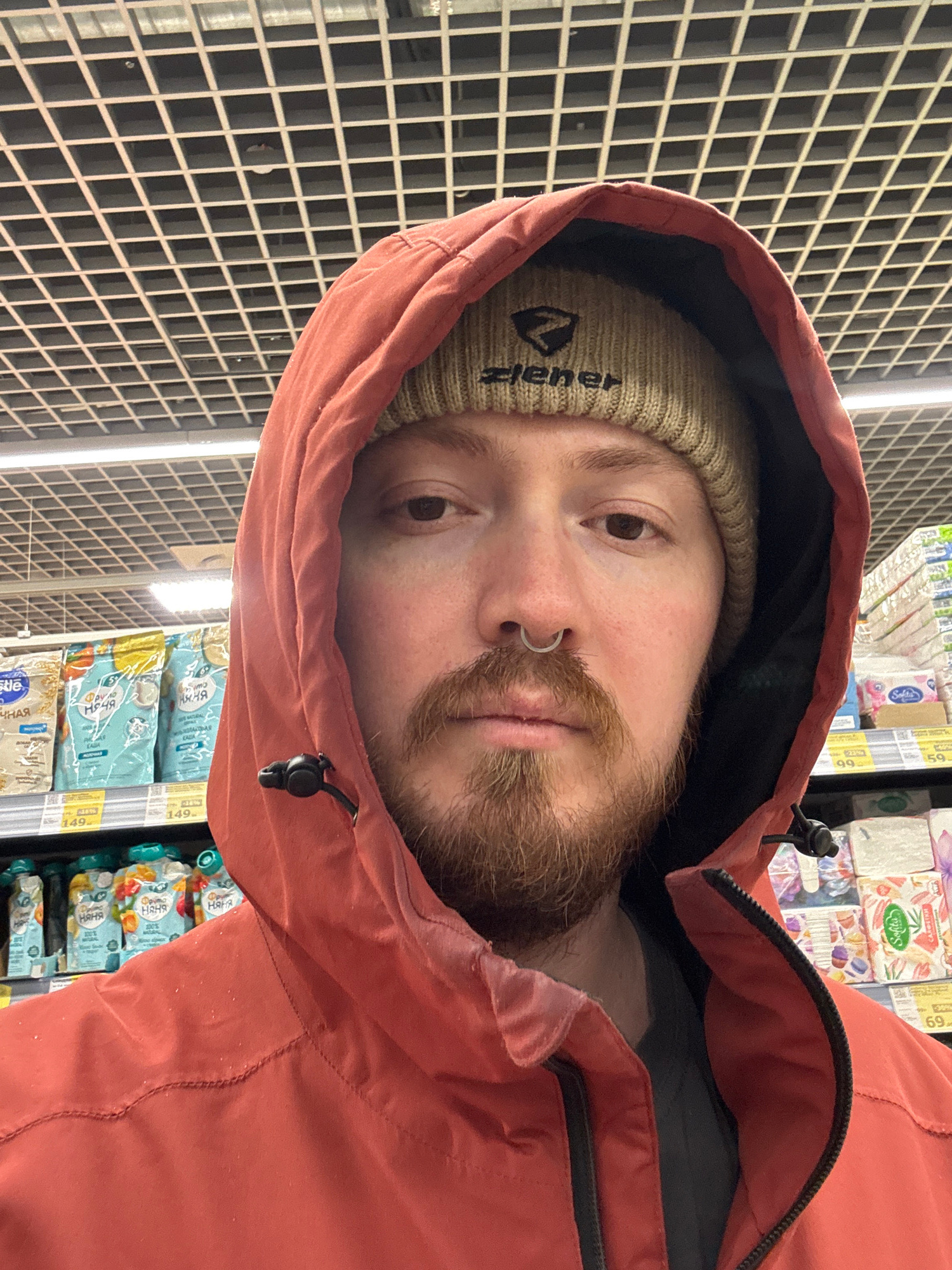 A man with a beard, wearing a beige beanie and a red hooded jacket, is taking a selfie indoors, possibly in a store. He has a nose ring and is looking at the camera. The background shows shelves with…read more