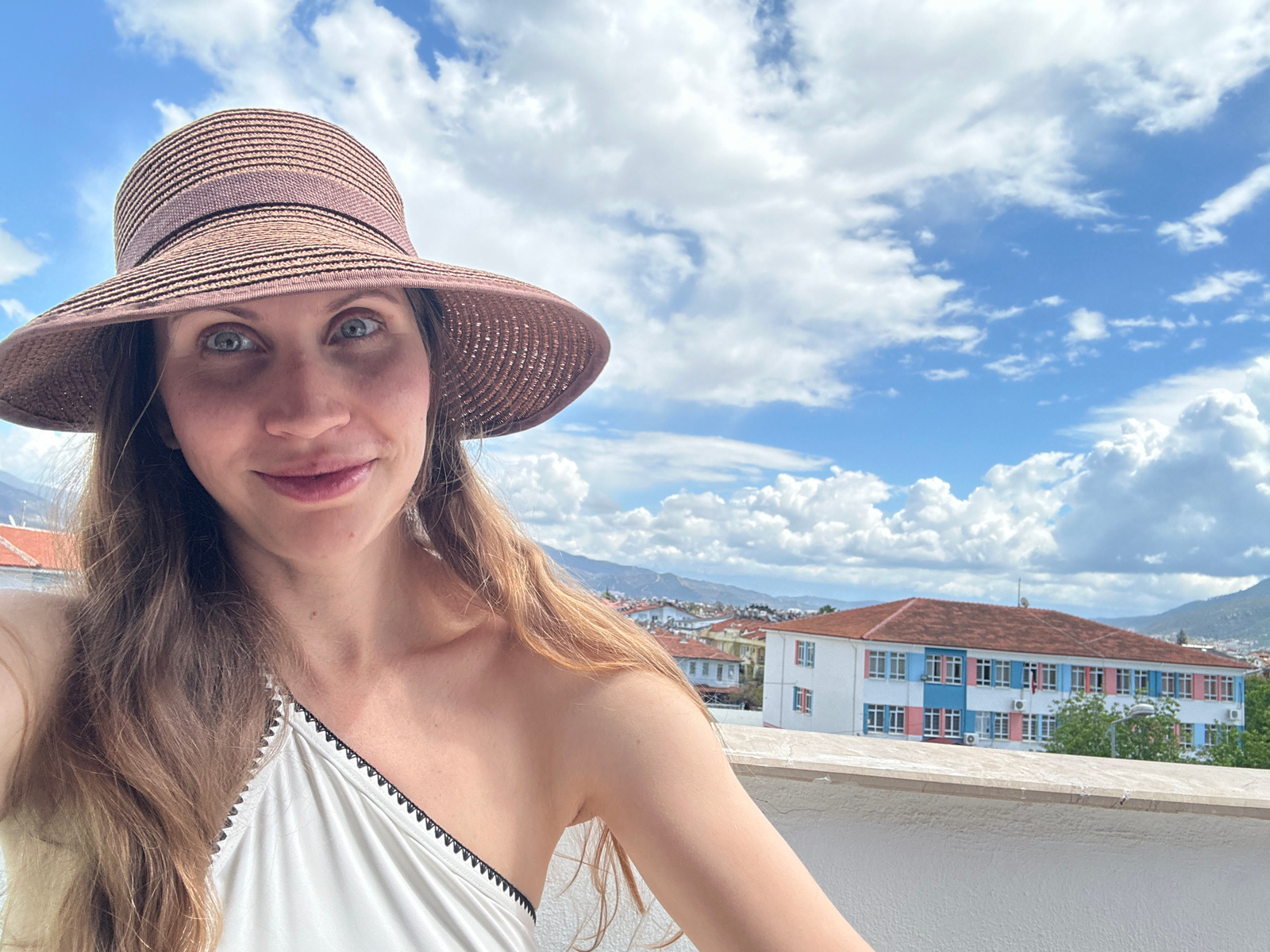 A woman wearing a straw hat and a white top is visible against a backdrop of a building, mountains, and a cloudy sky. The building appears to be a school, identifiable by its blue and white exterior w…read more
