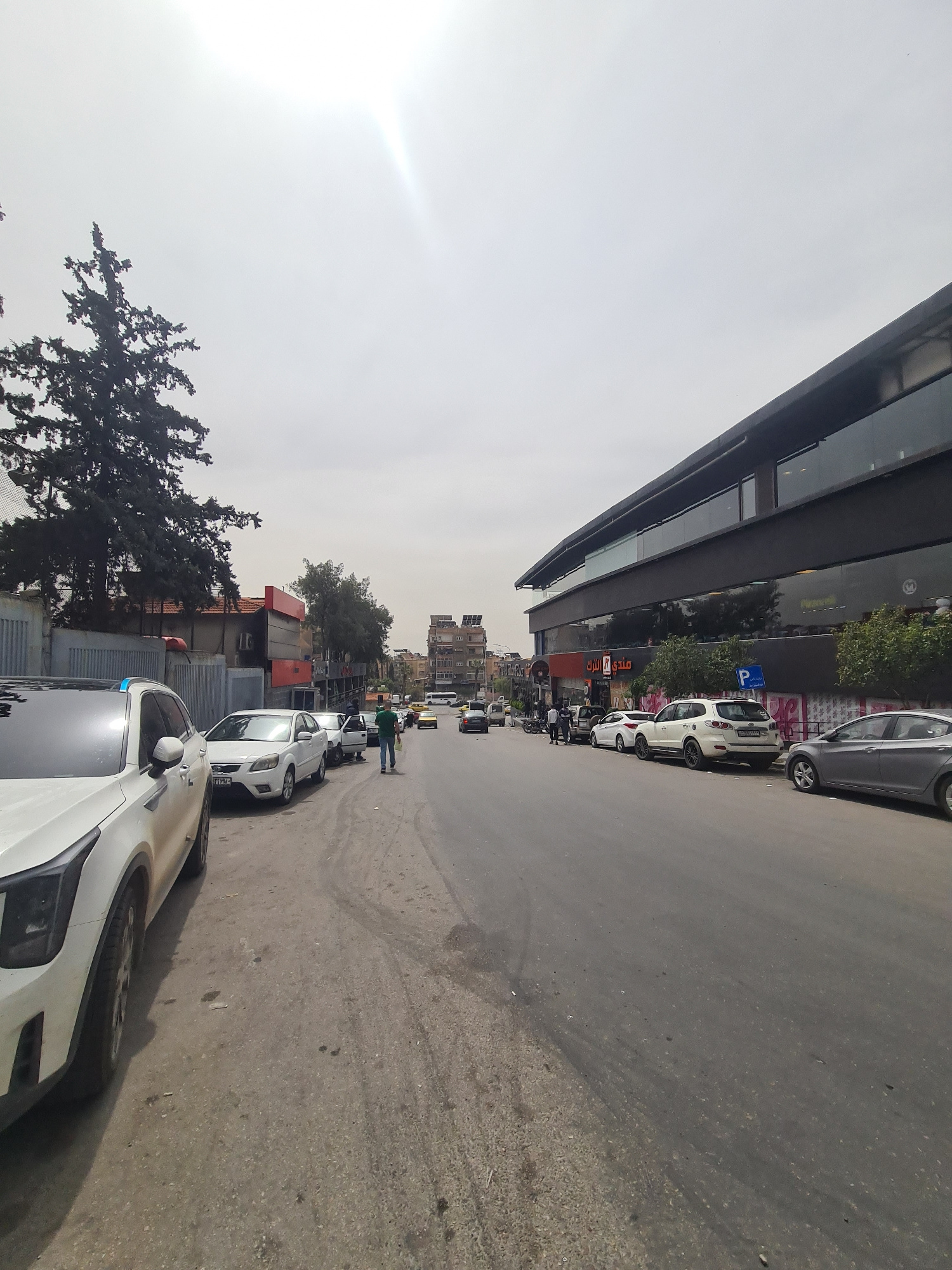 The image shows a street in Barza Municipality, Syria. Cars are parked along both sides of the street. A person wearing a green shirt walks on the sidewalk. Buildings are visible on either side of the…read more