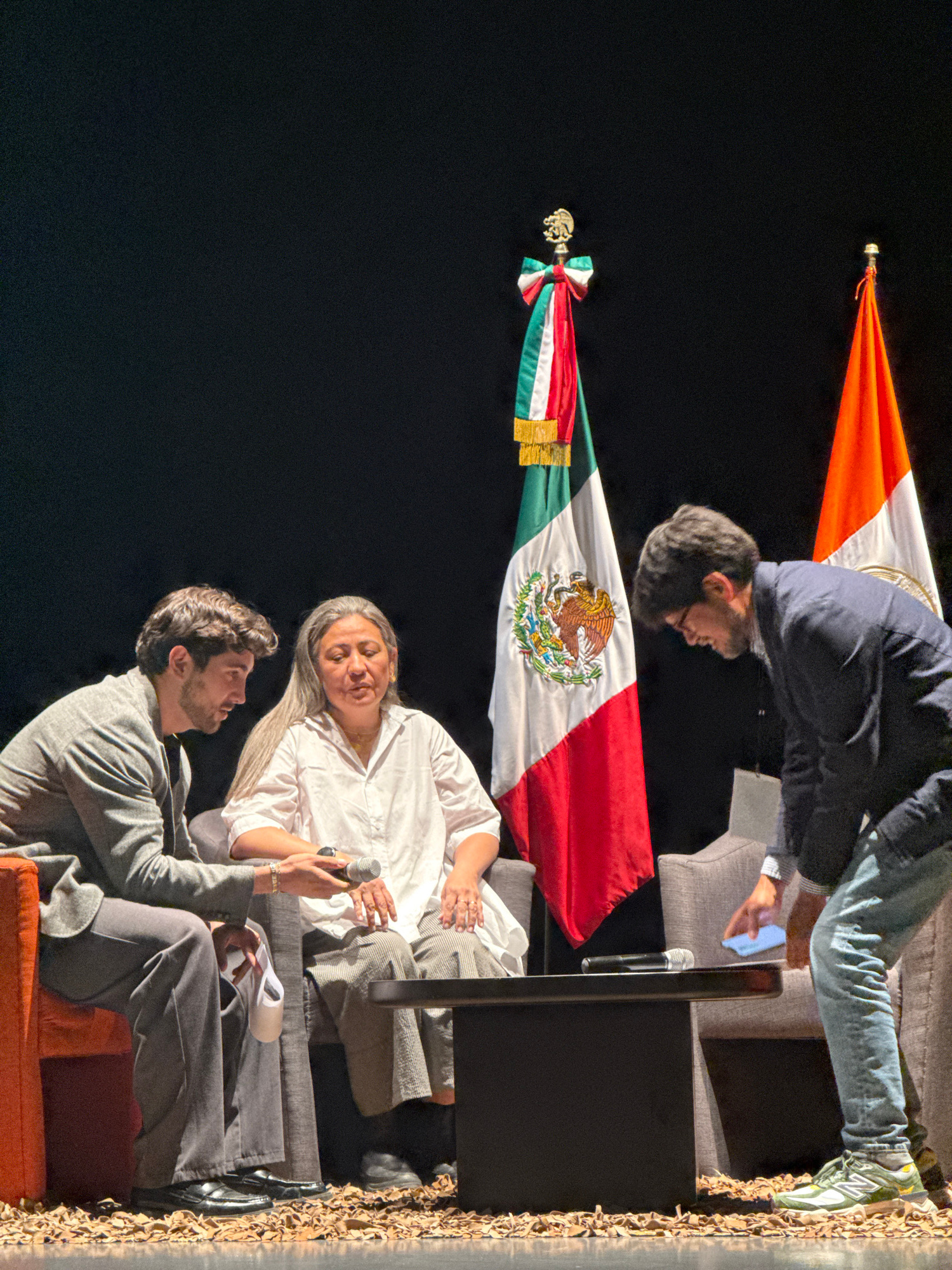 The image depicts a panel discussion in San Andrés Cholula, Mexico. Three people are seated on a grey sofa on a stage in front of the Mexican flag. A man on the left, in a grey suit, holds a micropho…read more