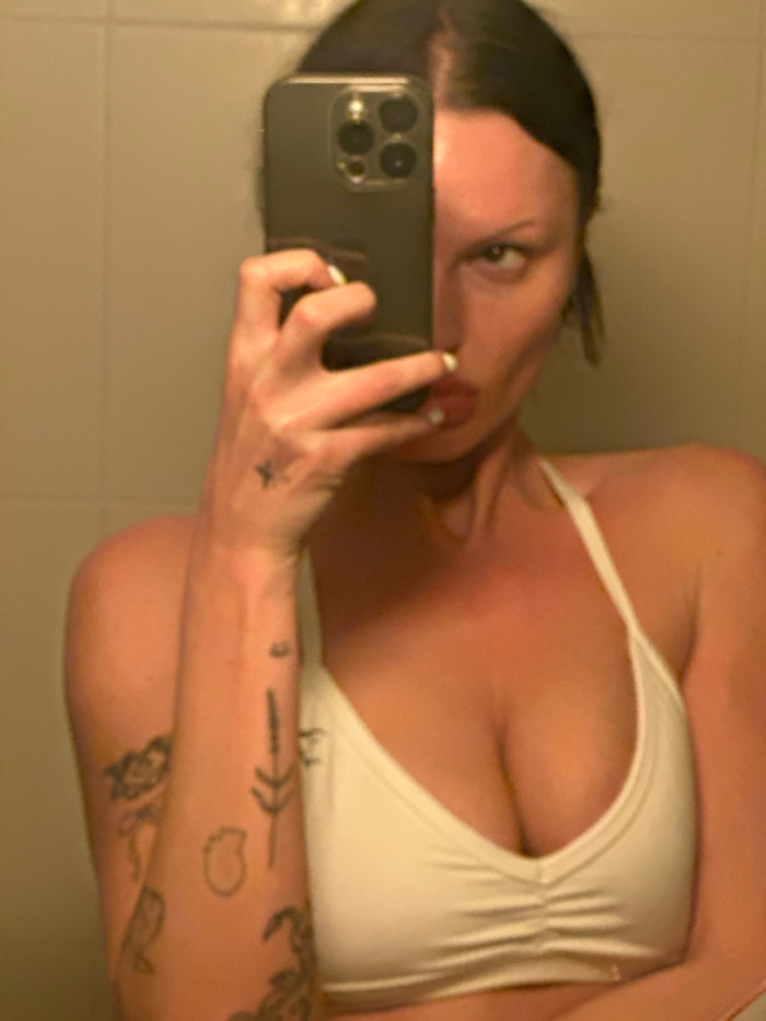 A woman takes a selfie. She holds a smartphone to capture her face, partially obscured by the device. She's wearing a white top, possibly a sports bra or swimsuit, revealing her chest. Her left arm isβ¦read more