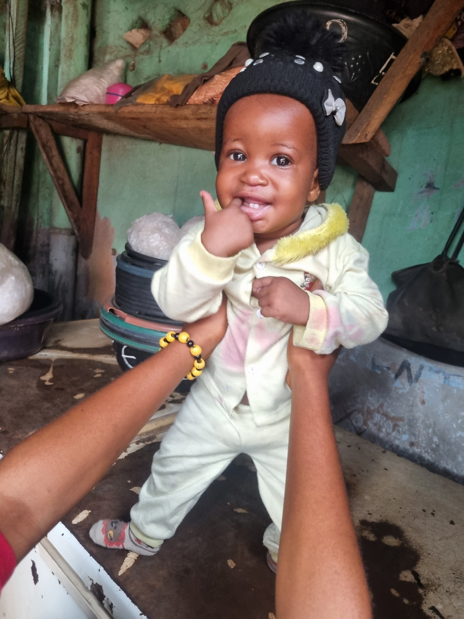 An angled, portrait-style photograph captures a joyful infant being held by an adult. The baby, appearing to be of African descent, has a wide, happy smile, with its tongue slightly out and a finger n…read more