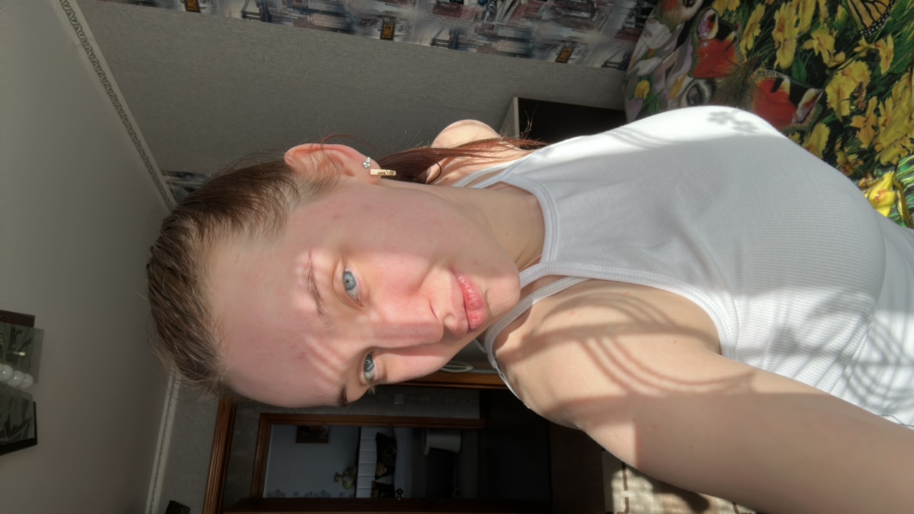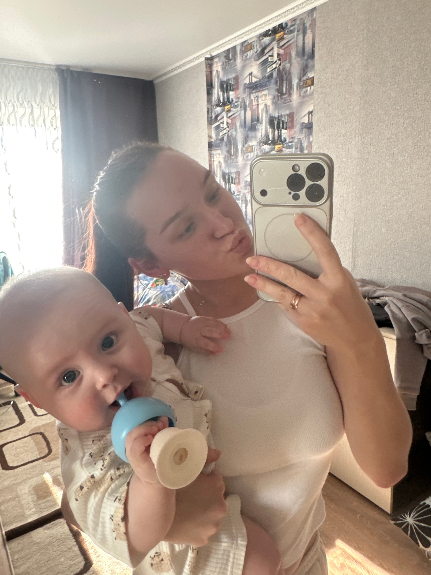 This media file is a mirror selfie taken by a woman with a baby, captured indoors. The image is oriented sideways, with the subjects appearing as if they are lying down horizontally. The woman, who h…read more