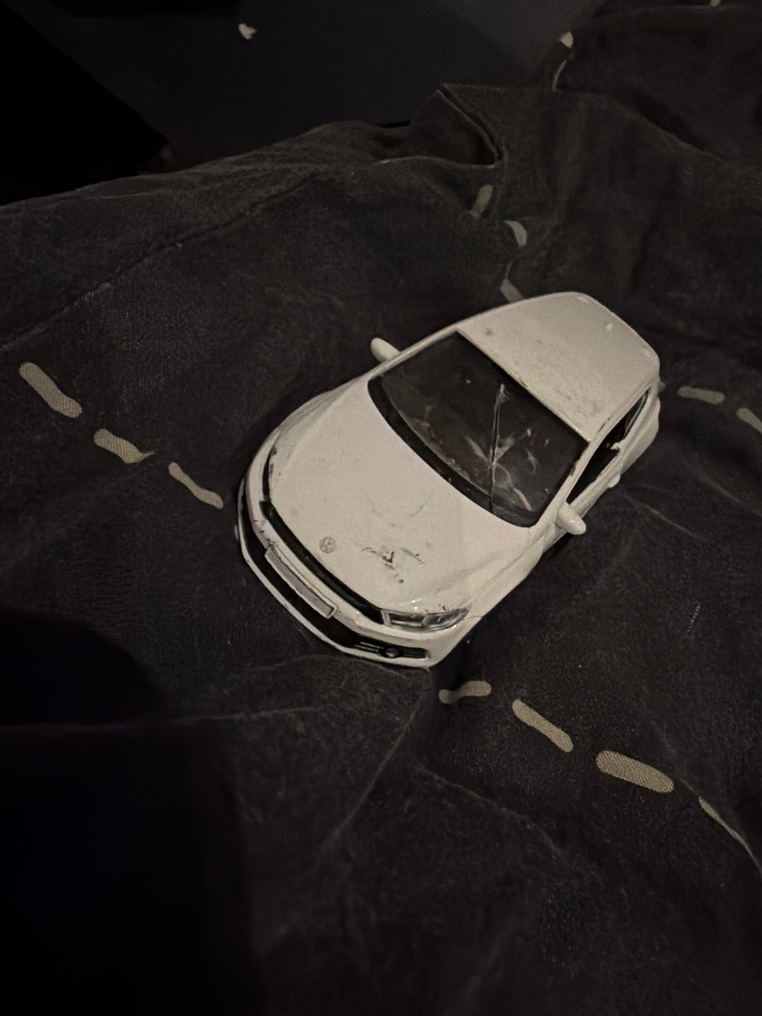 A white toy car with a cracked windshield sits on a dark fabric with dashed markings, resembling a stylized road. The car is positioned in the center of the frame and appears damaged. The location is…read more
