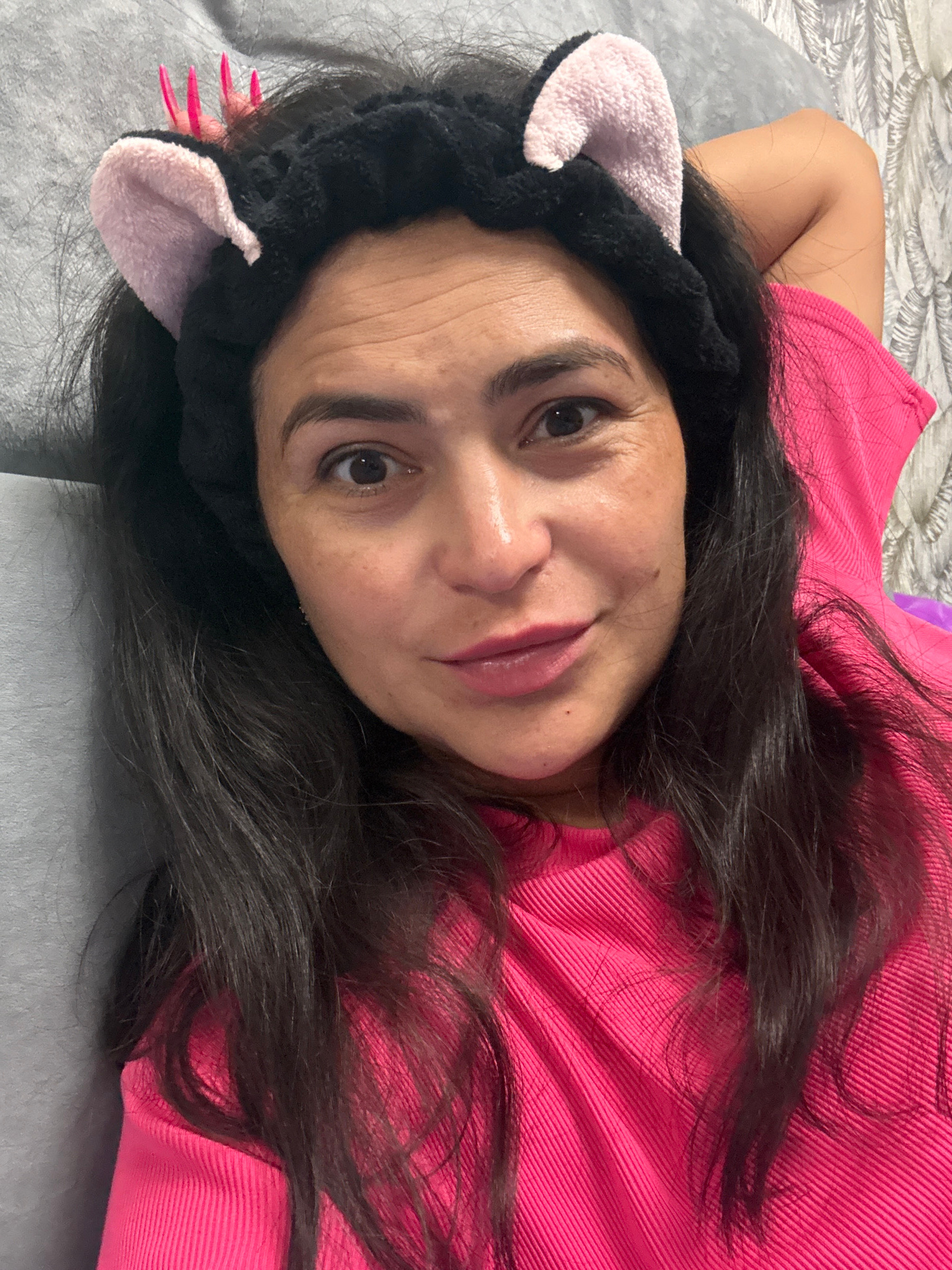 A person is lying on a gray surface, presumably a bed, and is wearing a pink shirt and a black headband with pink cat ears. The person has dark hair and is looking directly at the camera. A small purp…read more