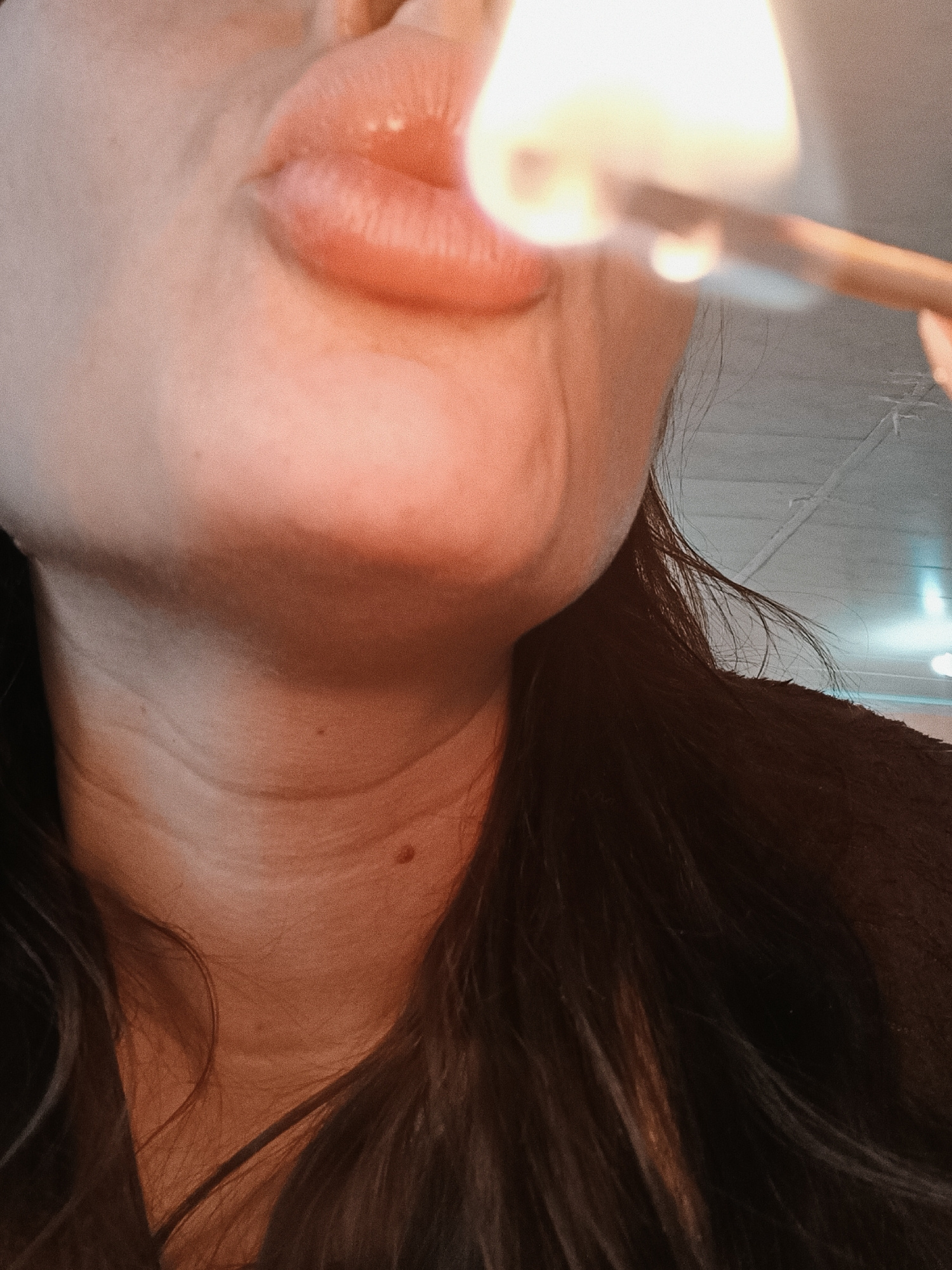 Close-up shot of a person holding a lit wooden object to their lips. The person's mouth, neck, and part of their chest are visible. The person has full lips and dark hair. A mole is visible on their nā¦read more