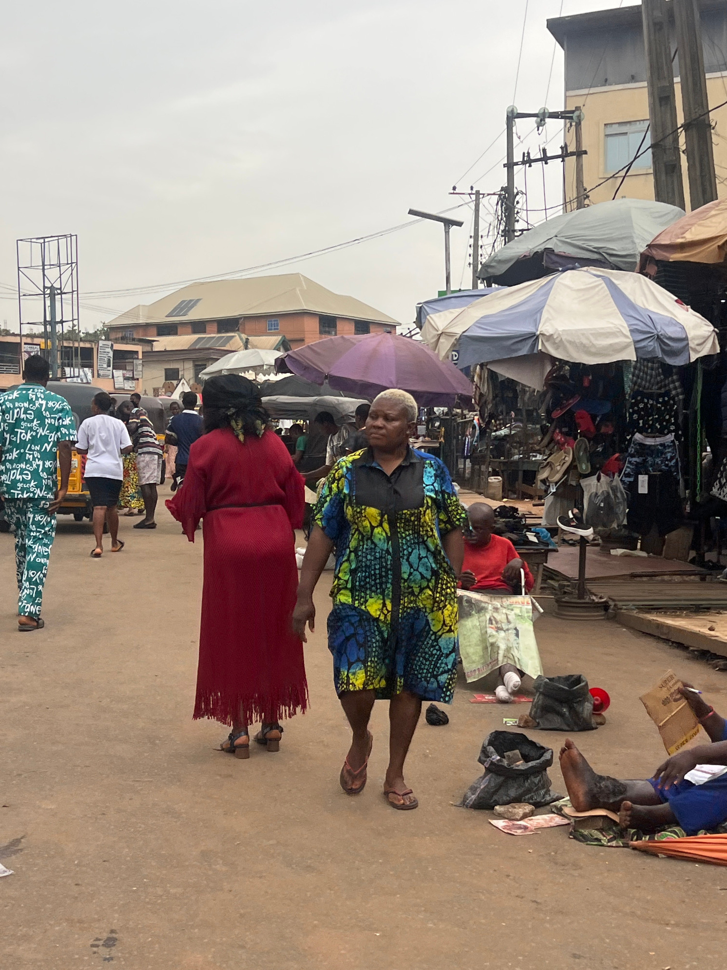 The image depicts a bustling market scene in Nkpor, Nigeria. Two women are in the foreground, one wearing a colorful blue and yellow patterned dress, and the other in a red dress. Behind them, a crowdβ¦read more
