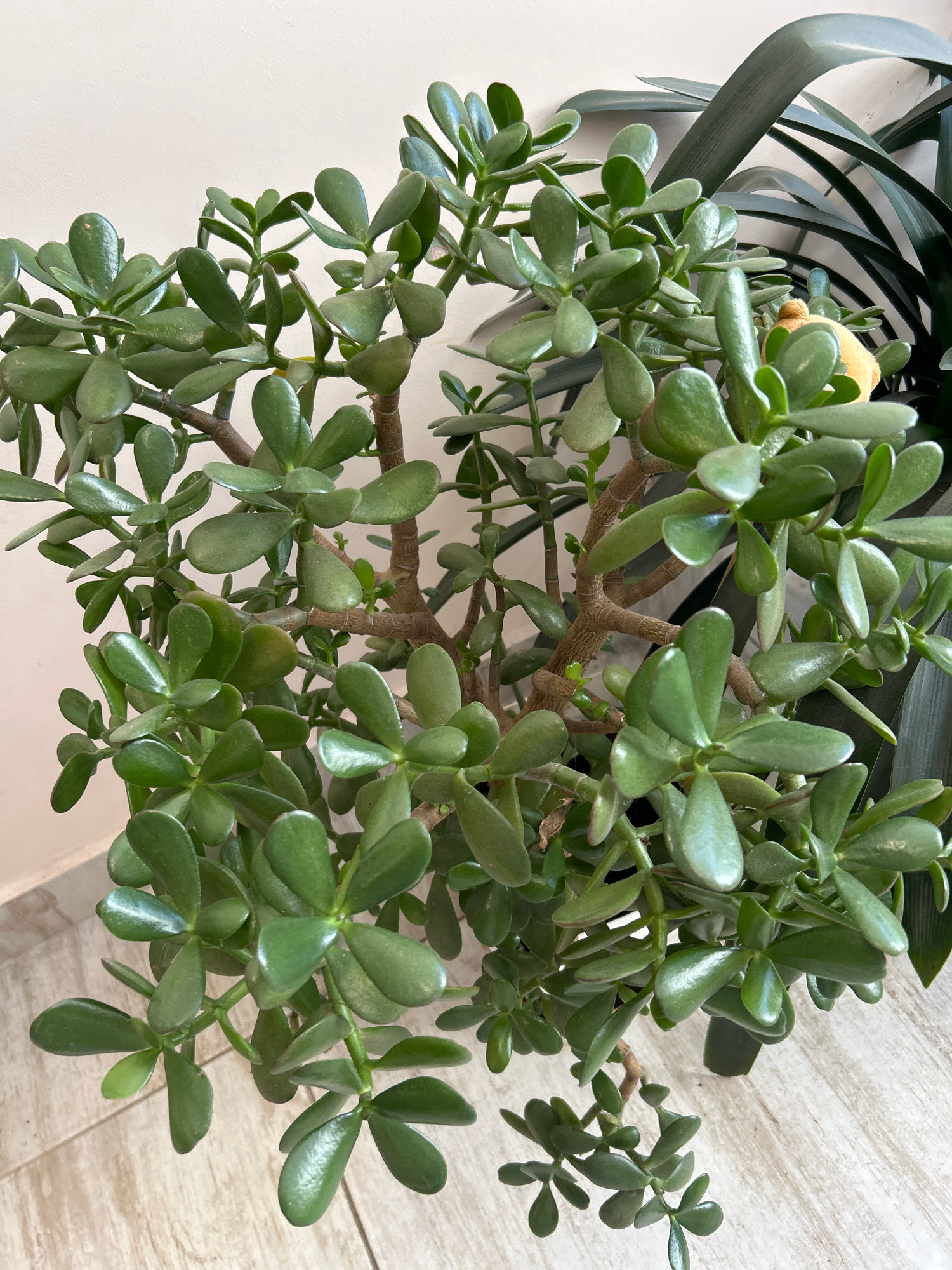 A high-angle shot depicts a jade plant, characterized by its thick, glossy green leaves and woody stems, in an indoor setting. The plant is densely foliated, obscuring much of the container it resides…read more