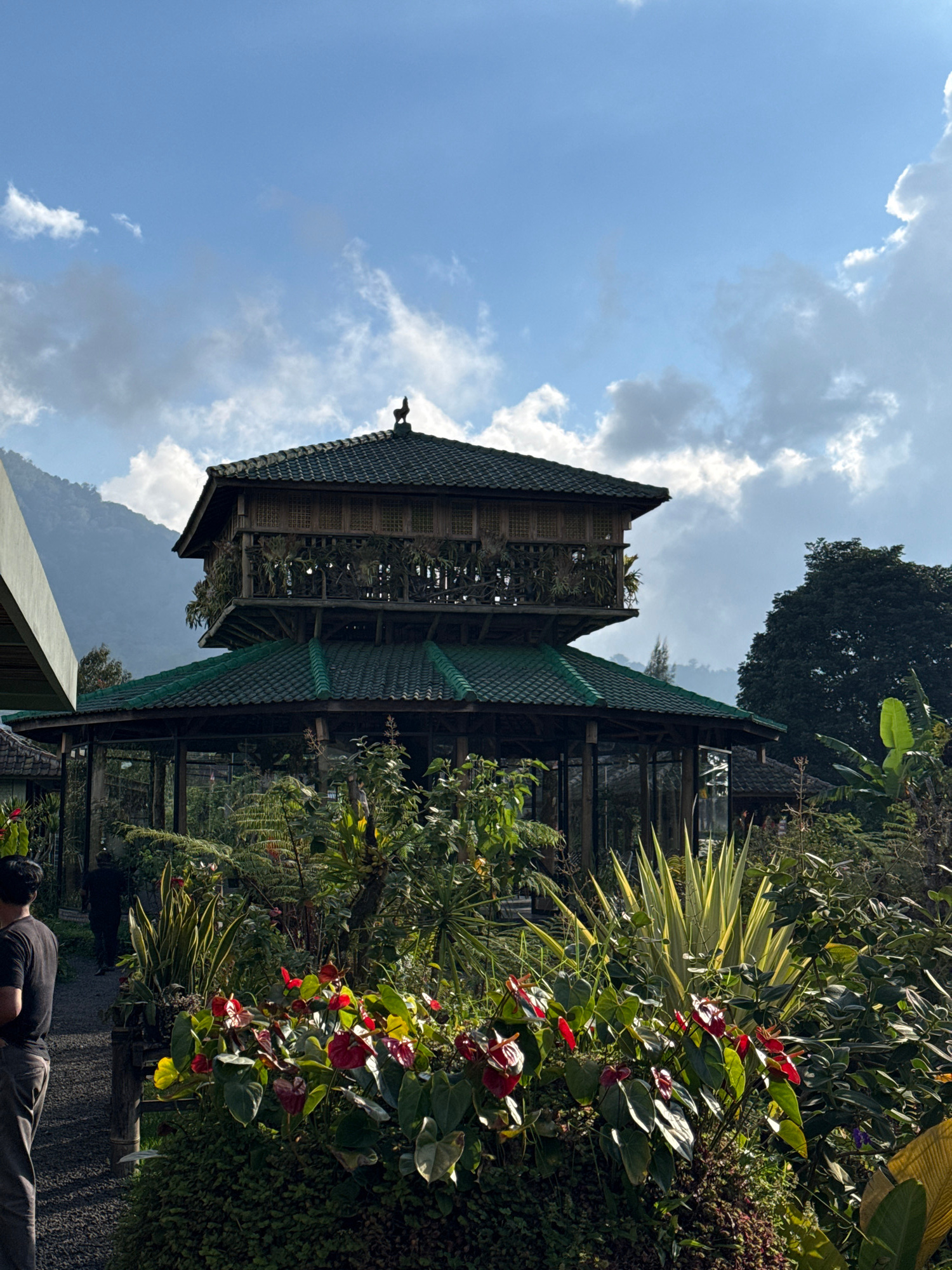 Here's a detailed description of the image: **Setting:** The image appears to be taken at or near a traditional-style structure, possibly a gazebo or tower, in a lush, tropical environment in Unknown…read more