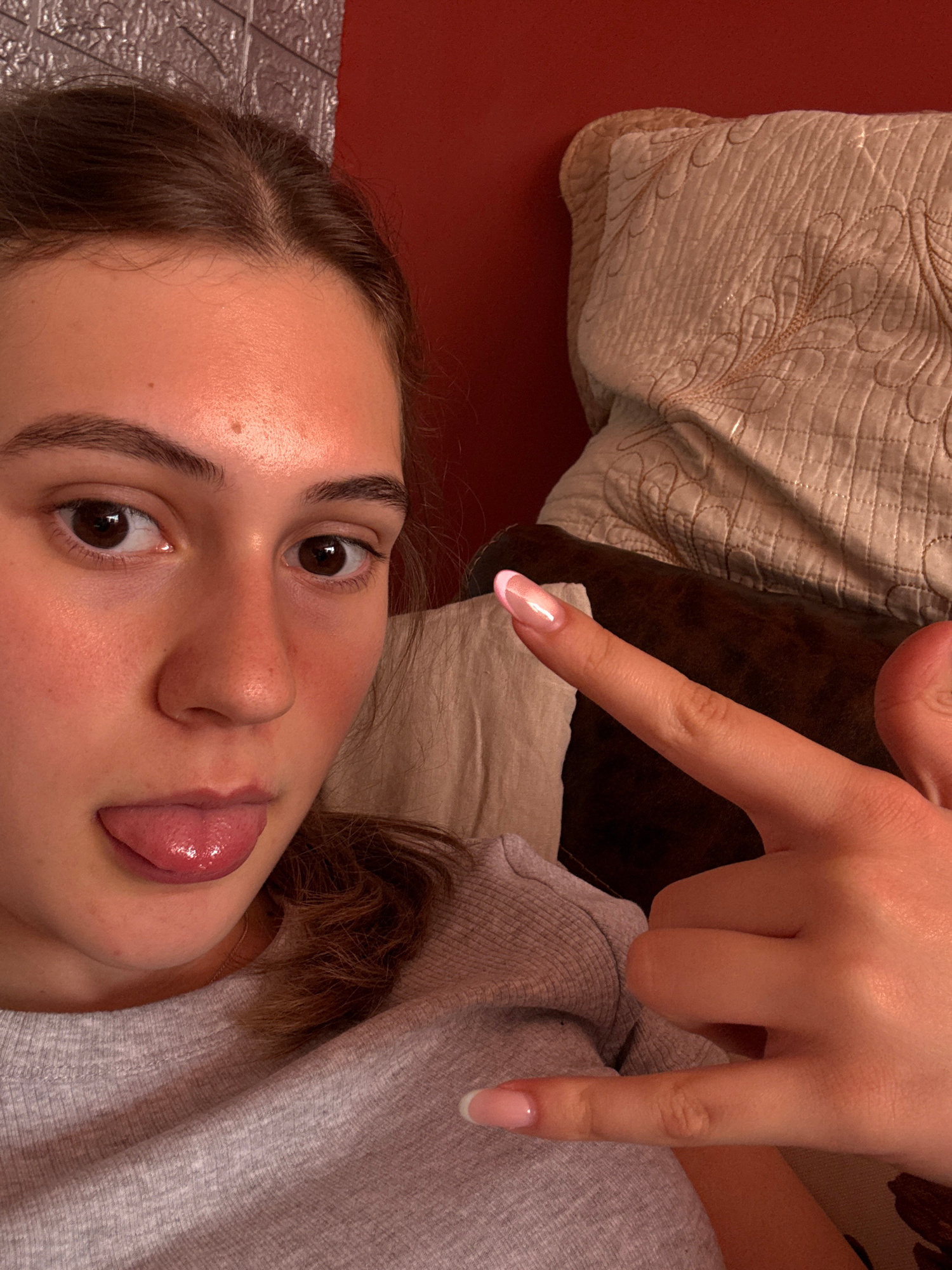 A close-up, eye-level shot features a young woman indoors. She is lying down, oriented with her head towards the bottom of the frame. Her brown hair is partially tied back. Her face is illuminated, hi…read more