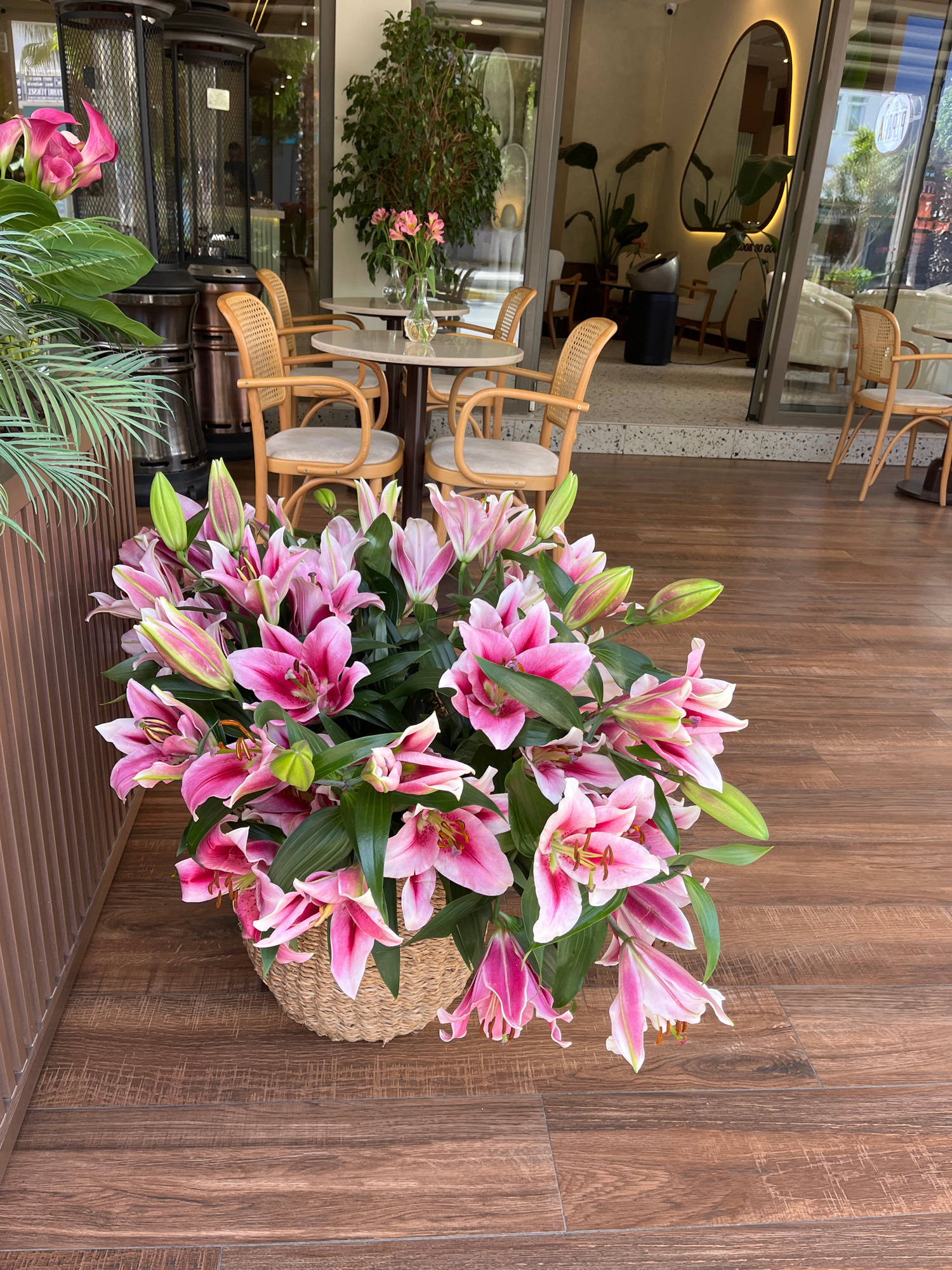 The image shows a bouquet of pink lilies in a woven basket, positioned on a brown, wood-like surface, possibly a table or counter. The bouquet is full, with many open blossoms and closed buds. The bac…read more