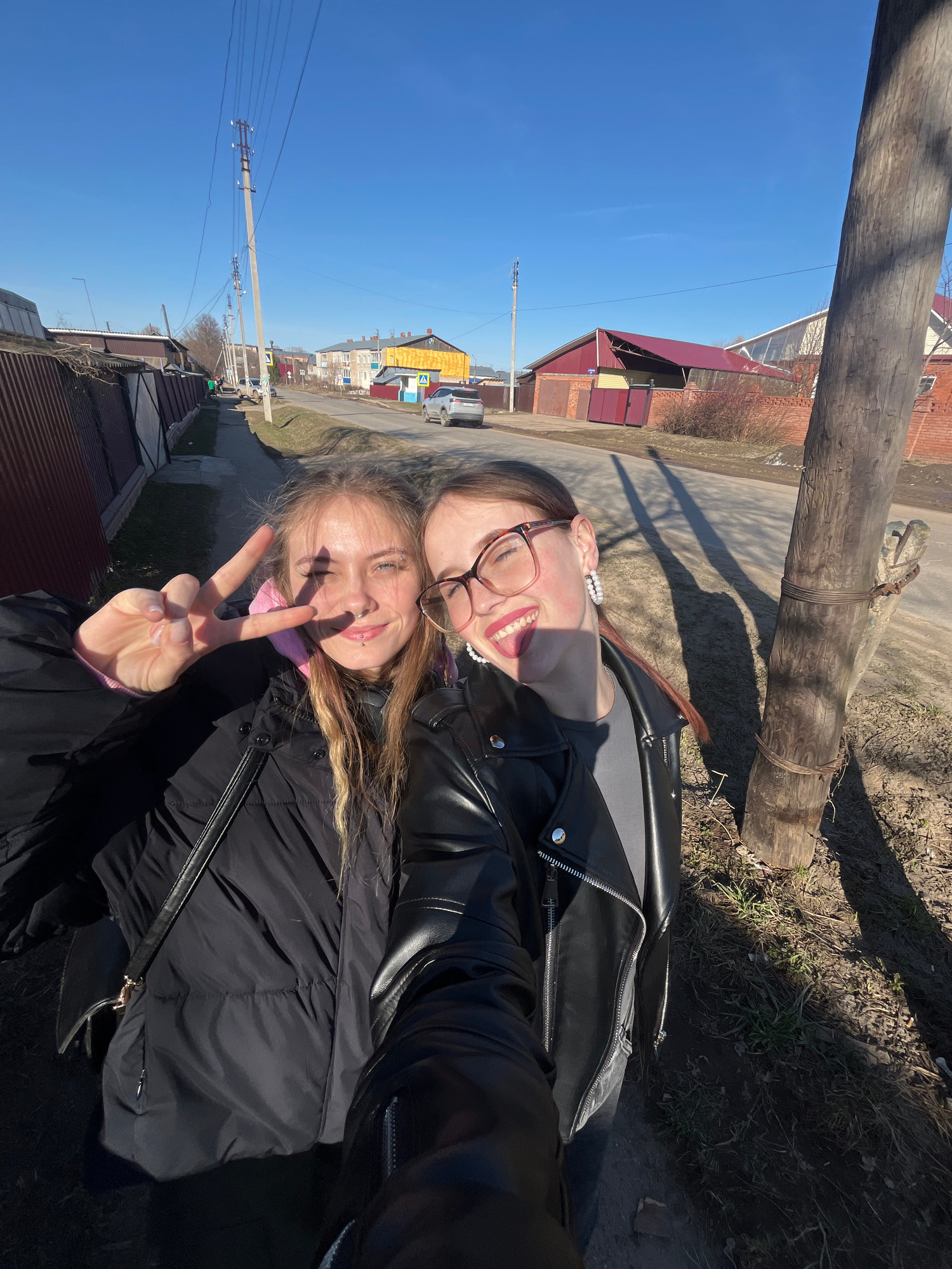 Two young women are captured in a bright, outdoor selfie, seemingly in the early spring or late autumn in Фоки, Russia. The image is oriented sideways, but the subjects are standing upright under clea…read more