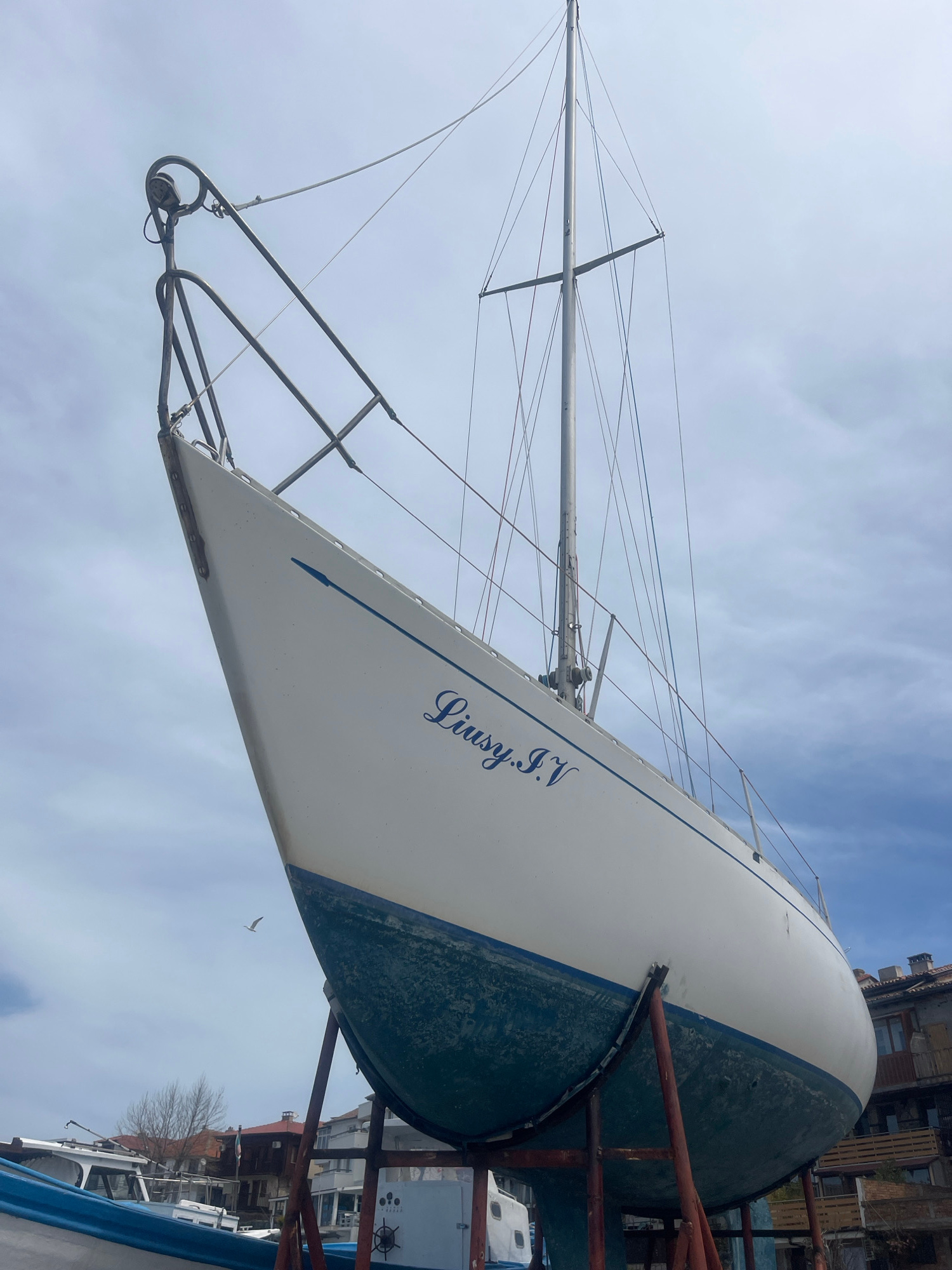A large white and blue sailboat, named "Linsy I.V" (or "Linsy IV") in blue script on its hull, is the primary subject of this bright, daytime image. The vessel is dry-docked on land, supported by robu…read more