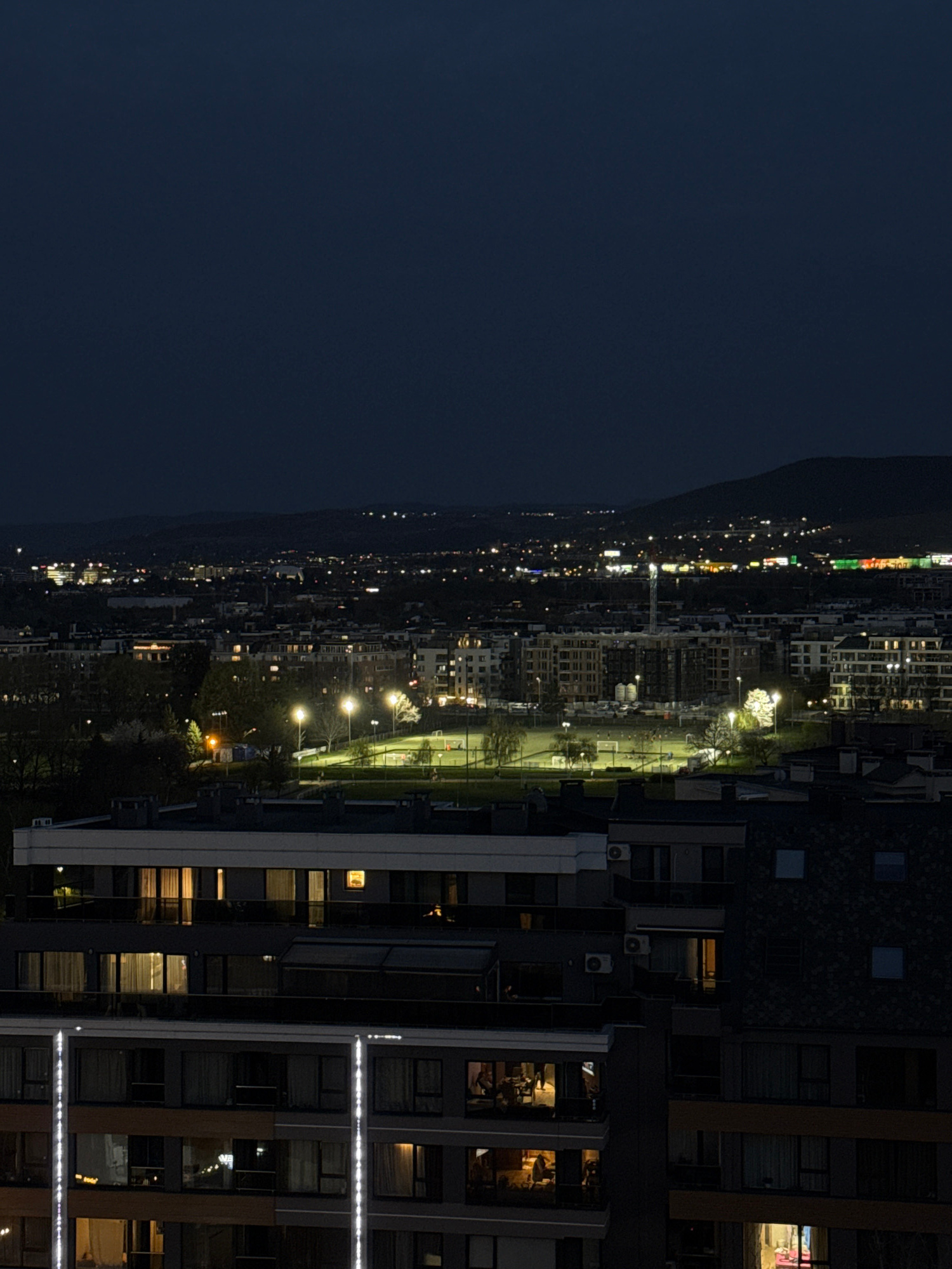 The image captures a night-time cityscape, likely from an elevated perspective, showcasing a blend of urban architecture and distant natural landscape. The sky is a deep, dark blue, indicating late ev…read more