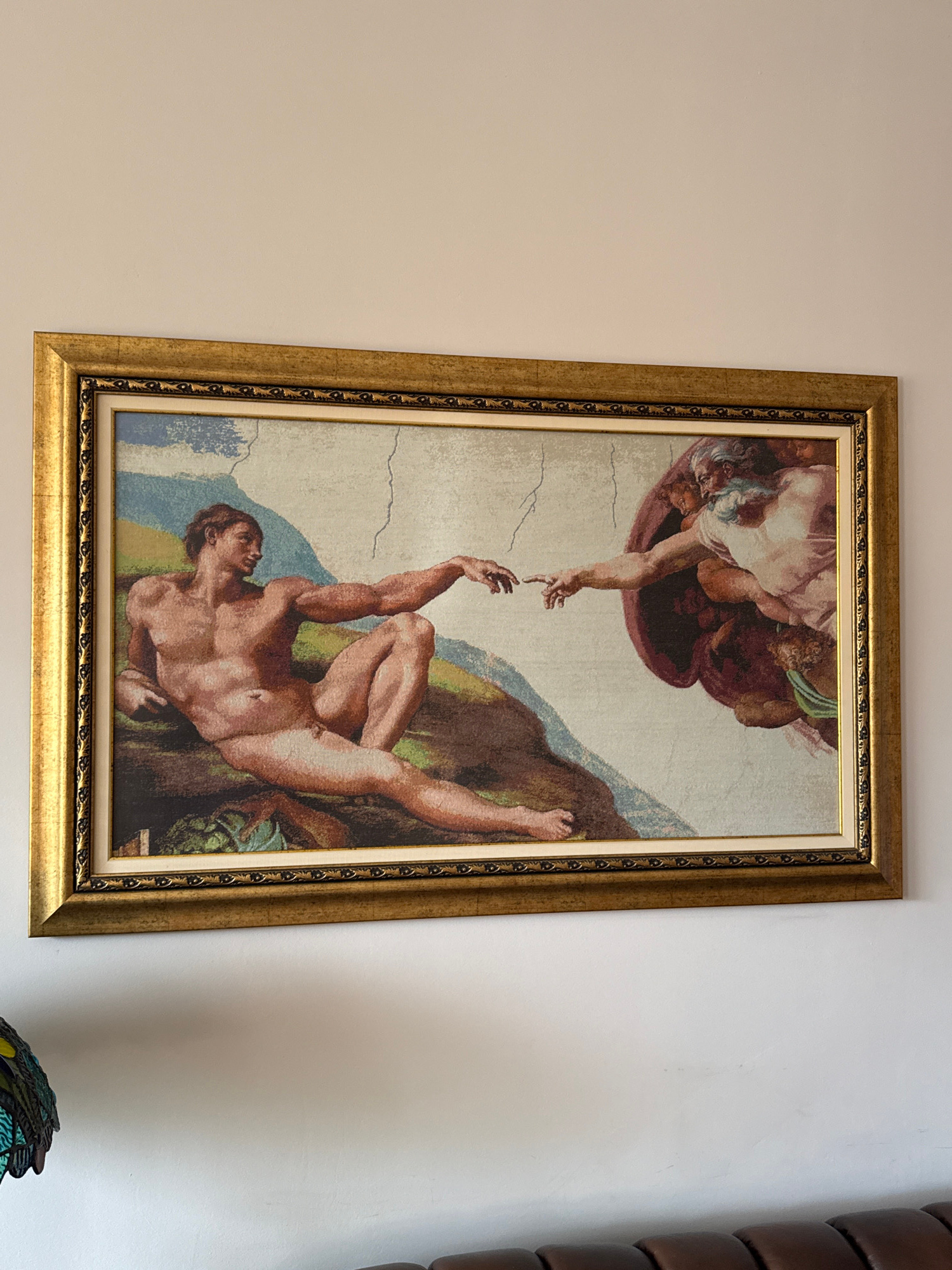A framed tapestry of Michelangelo's "The Creation of Adam" hangs on a white wall. The tapestry is rectangular and depicts the famous scene of God reaching out to Adam. The frame is gold with an ornateβ¦read more