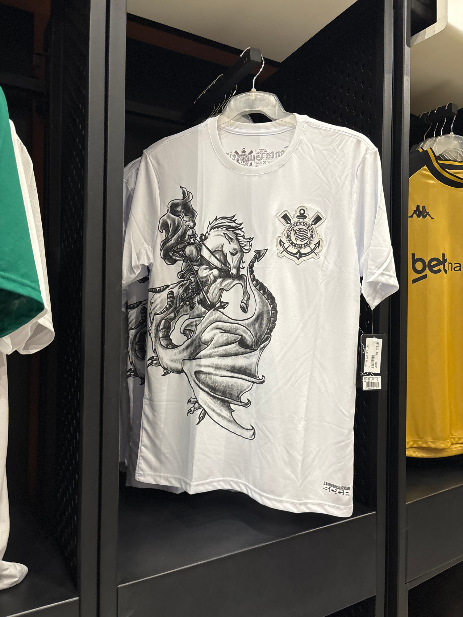 The image shows a white shirt hanging on a shelf in what appears to be a retail environment. The shirt features a Corinthians Paulista crest and a black and white illustration of a dragon rider. Above…read more
