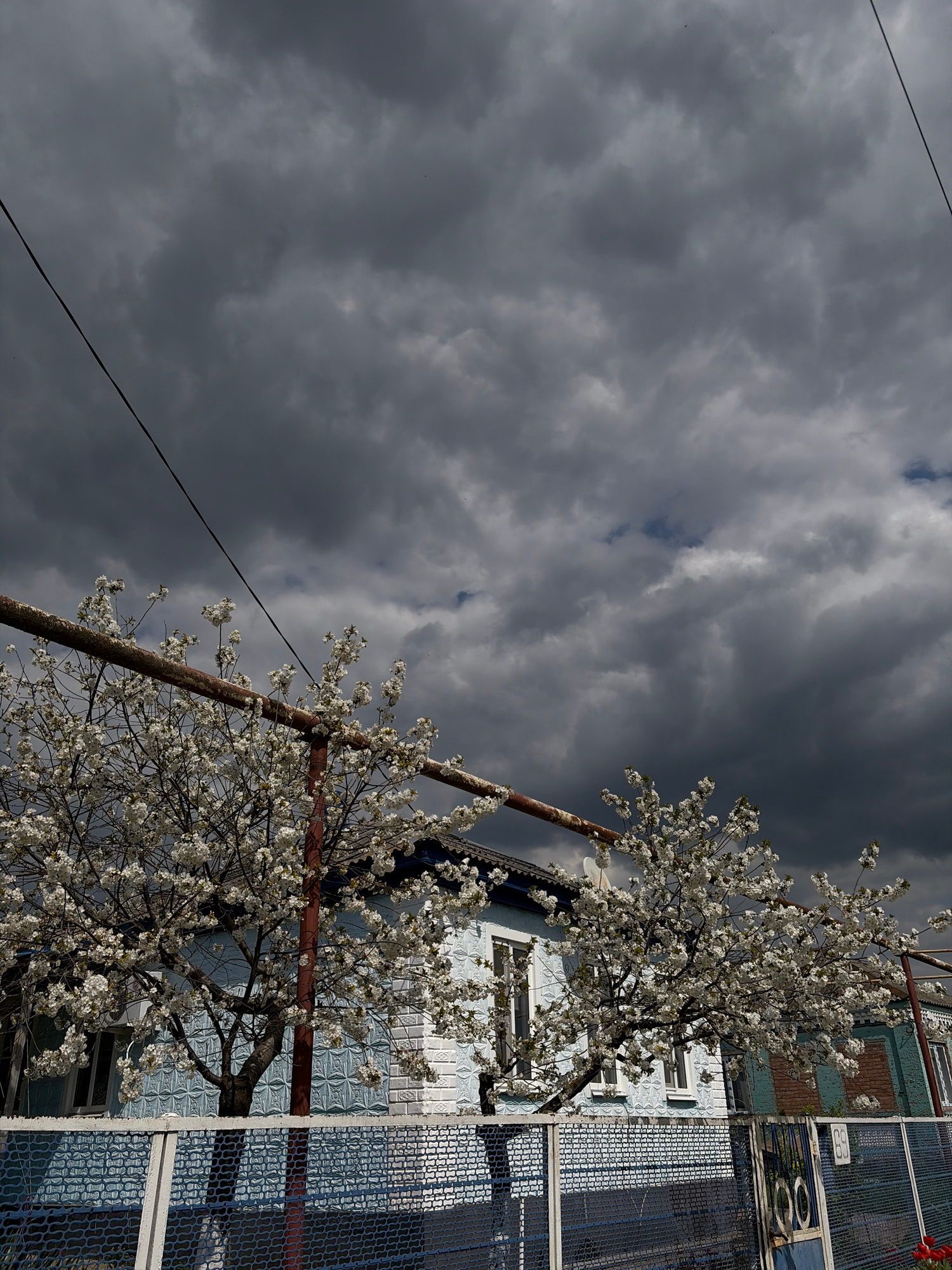 The image captures an outdoor scene featuring a flowering tree against a backdrop of a building and an overcast sky. The perspective is angled upwards, emphasizing the sky and the upper portions of th…read more