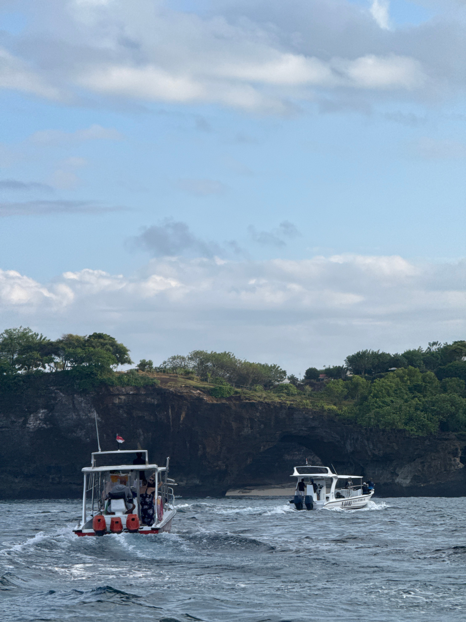 The image depicts a coastal scene in Nusa Penida, Indonesia, featuring two small, white motorboats on the water. Both boats appear to be carrying passengers. The background shows a rocky coastline covered in lush, green vegetation. The sky is cloudy, with a mix of blue patches and overcast areas. The water is choppy, indicating some wind or current activity. | Open Wire