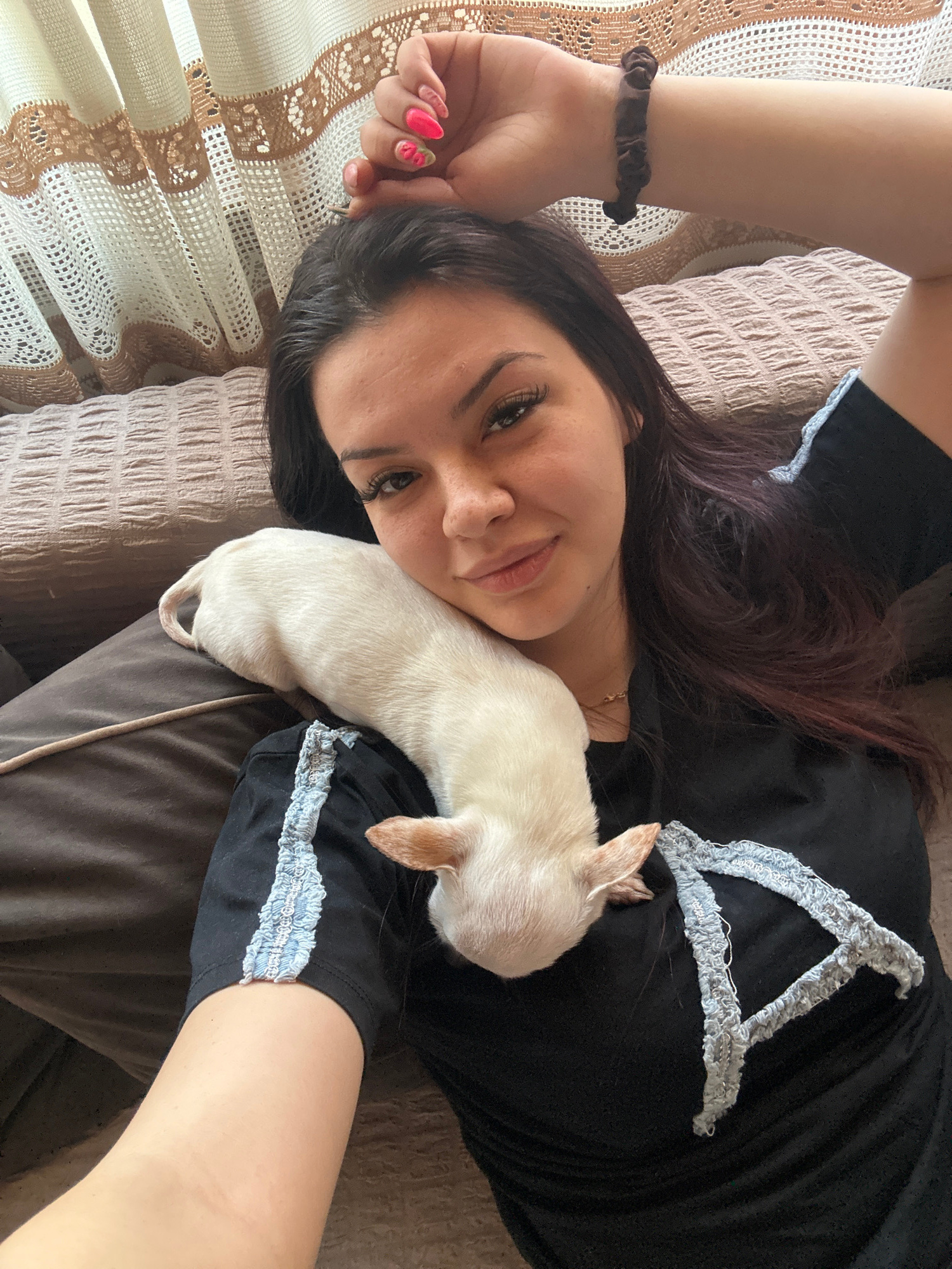 A young woman is lying on a bed indoors, with a small white dog resting on her upper body. The woman has dark hair and fair skin. She is wearing a black shirt with decorative trim. Her left hand is vi…read more