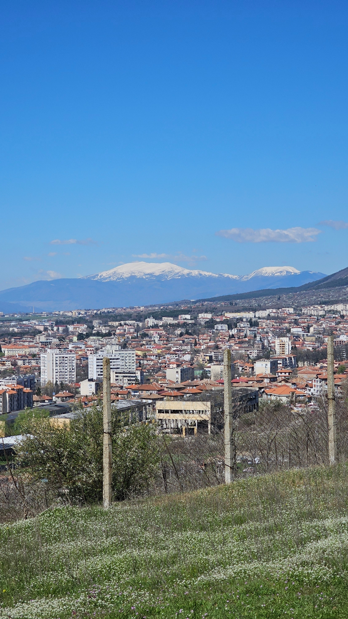 The image shows an aerial view of Karlovo, Bulgaria. A mountain range with snow-capped peaks is visible in the background, left of the cityscape. The city consists of closely packed buildings, predomi…read more