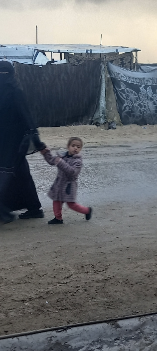 A young child wearing a checkered coat and pink pants is running outdoors, with a dark object in the foreground possibly held by them. Behind the child, the ground appears to be a dirt or gravel surface. In the background to the left, there is a structure covered with fabric or tarps, resembling a makeshift dwelling. The overall scene suggests a setting of poverty or displacement. | Open Wire