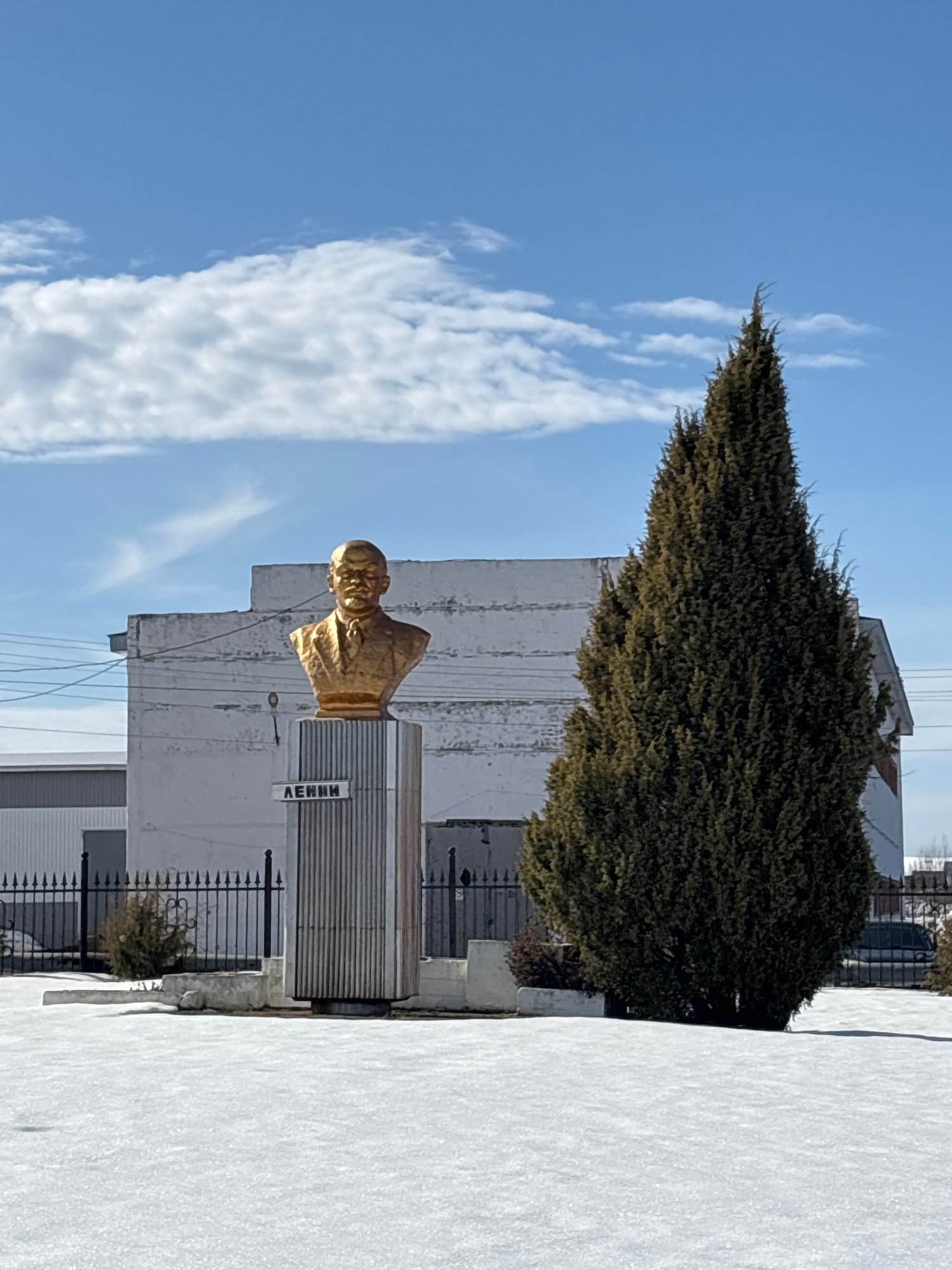 A golden bust of Vladimir Lenin, depicted wearing a suit and tie, stands atop a tall, fluted cylindrical pedestal in the city of Foki, Russia. The pedestal features the name "ЛЕНИН" (LENIN) inscribed…read more