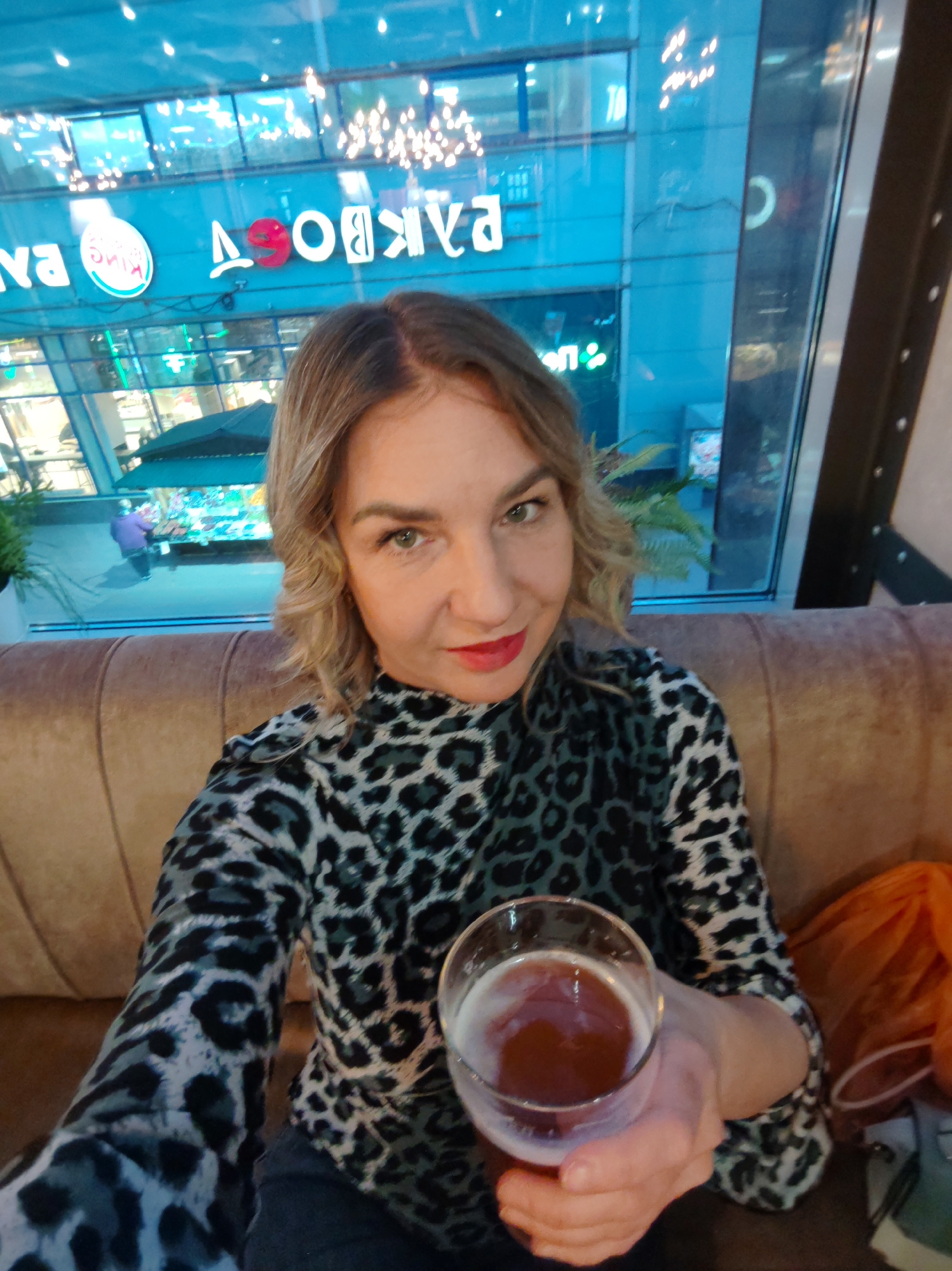 A woman is taking a selfie indoors, seated on a comfortable upholstered sofa or booth in what appears to be a restaurant, bar, or cafe. She has blonde, wavy hair, light-colored eyes, and is wearing re…read more