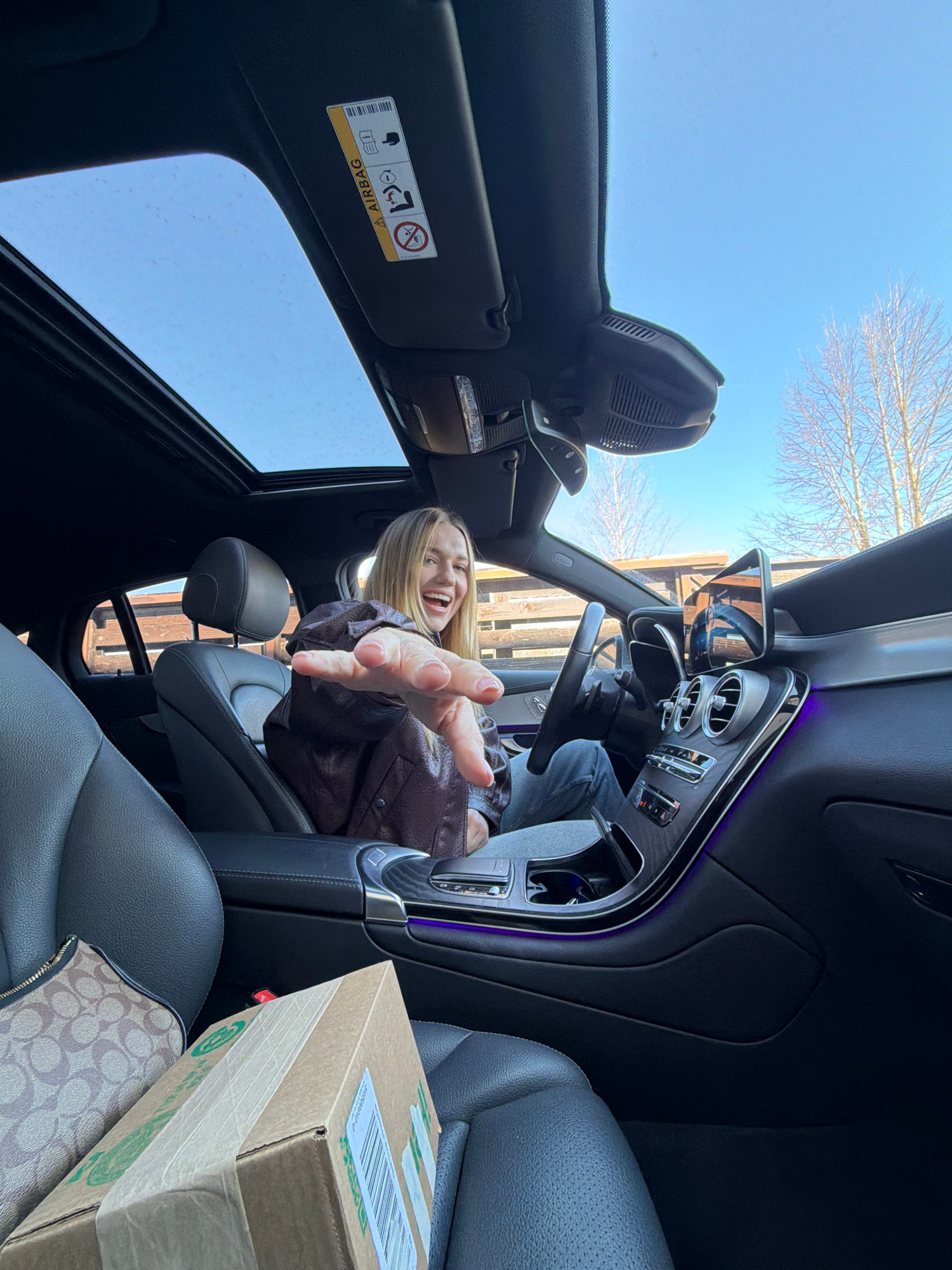 A view from inside a car, oriented vertically, with a fair-skinned woman with blonde hair leaning into the frame. Her hand is extended towards the camera, and she has a wide smile on her face. The car…read more