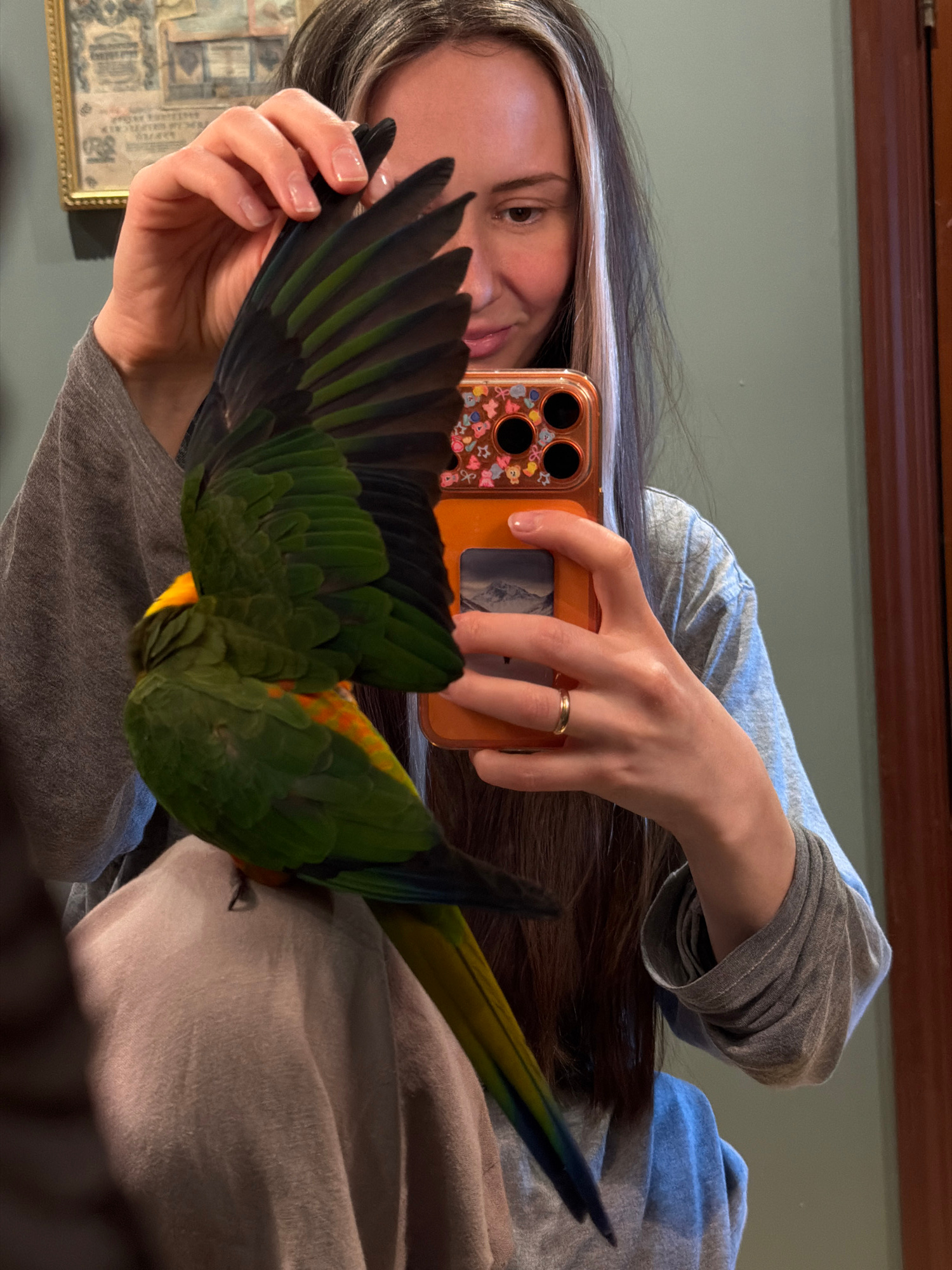 A woman holds a phone in her hands and takes a picture of a parrot. The woman has long dark hair with a streak of light hair. She wears a light blue shirt under a grey shirt, and a gold ring is visibl…read more
