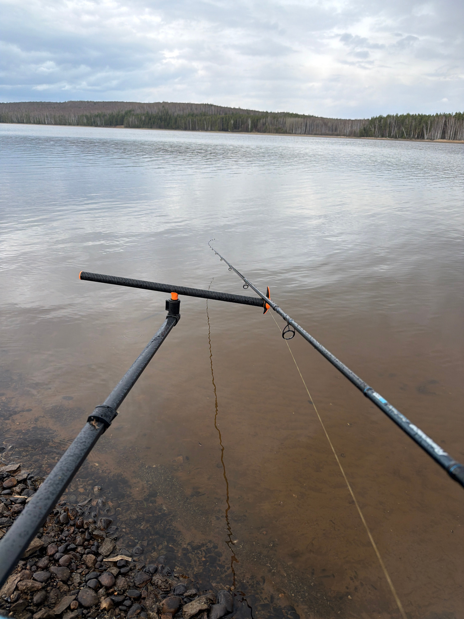 The image shows a fishing rod extended over a body of water, likely a lake or wide river, judging by the distant shoreline with a dense forest. The fishing rod has a dark-colored handle with orange ac…read more