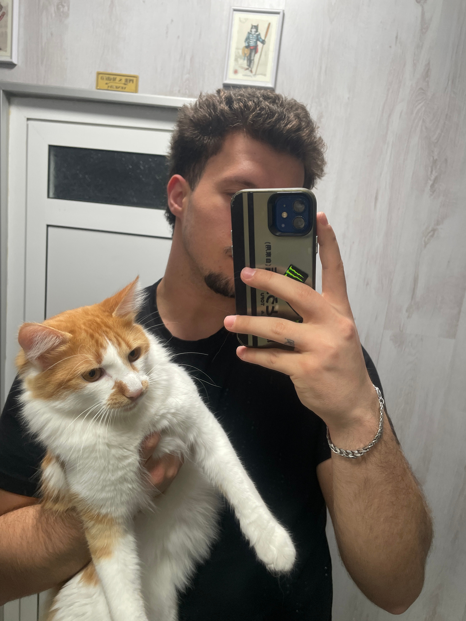 A man in a black shirt is holding a large orange and white cat, taking a selfie in what appears to be an indoor environment. He is holding up a smartphone with a distinctive case, which has stickers o…read more