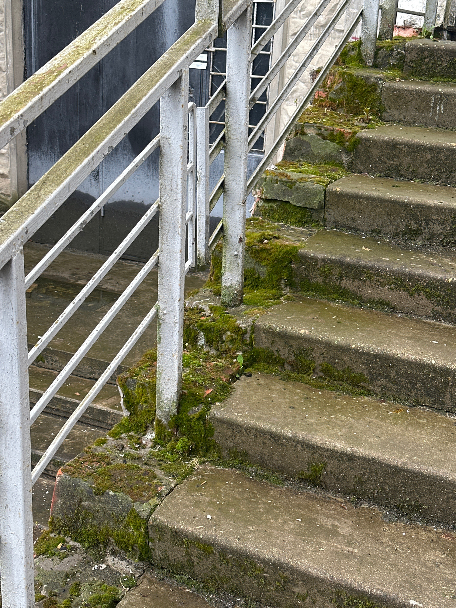 The image shows a set of concrete stairs with a gray metal railing. Moss grows on the edges and between the steps of the stairs. The setting appears to be outdoors. No people are visible. The location…read more