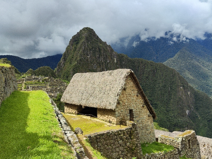 A stone hut with a thatched roof nestles on a green, grassy terrace in Machu Picchu. Behind it, jagged mountains rise into a cloudy sky. In the distance, more ruins are visible, hinting at the scale o…read more