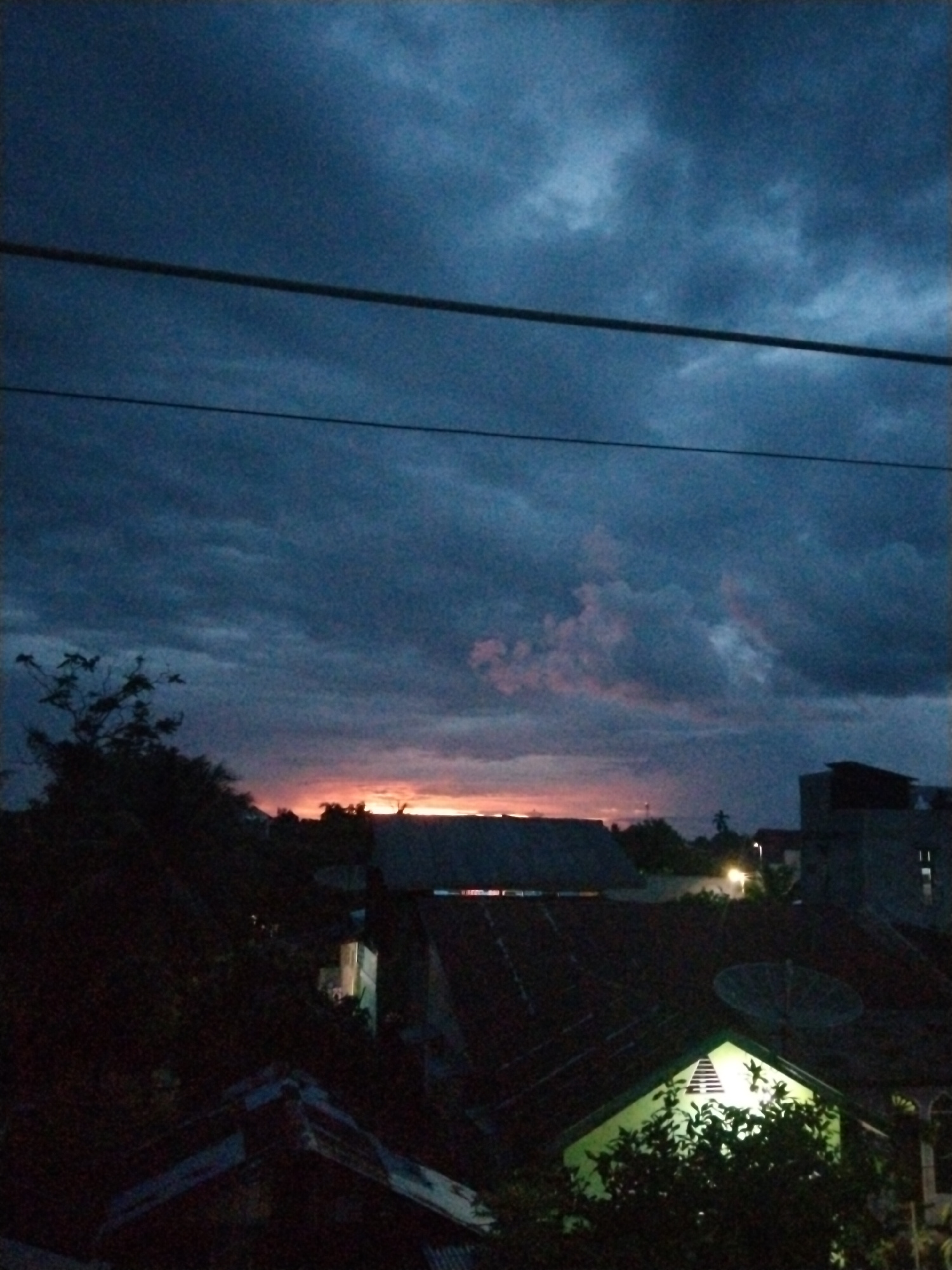 The image depicts a cityscape in Bireuenmeunasahdayah, Indonesia, at dusk. The sky is filled with dark, heavy clouds tinged with orange and pink hues near the horizon, indicating a recent or upcoming…read more