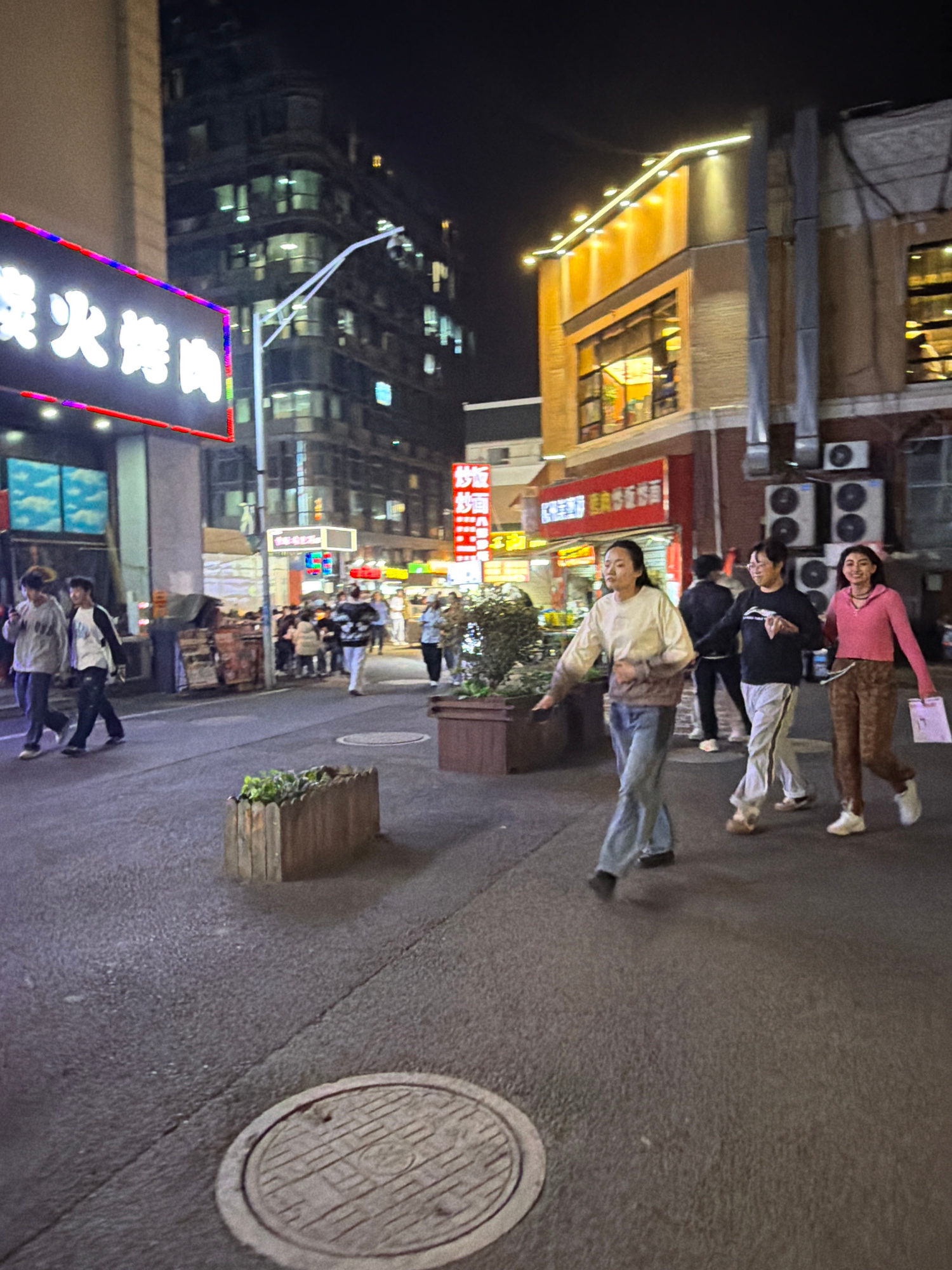 The image depicts a nighttime street scene in a commercial area within Jiangning District, China. The environment is illuminated by various artificial light sources, including neon signs, building lig…read more