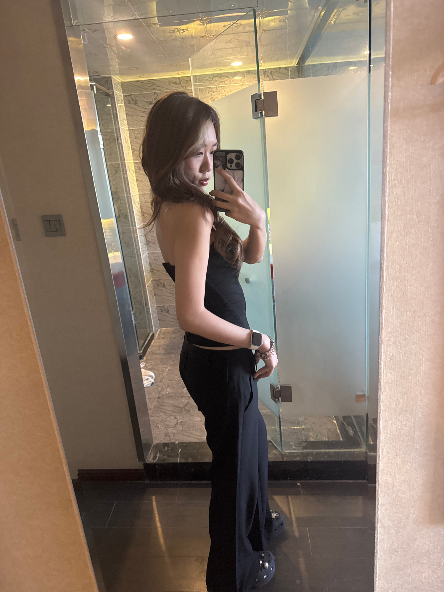 A young woman is depicted in a mirror selfie, taken indoors within what appears to be a modern bathroom or hotel room in Ganzhou, China. She is positioned upright, holding a dark-colored smartphone wi…read more