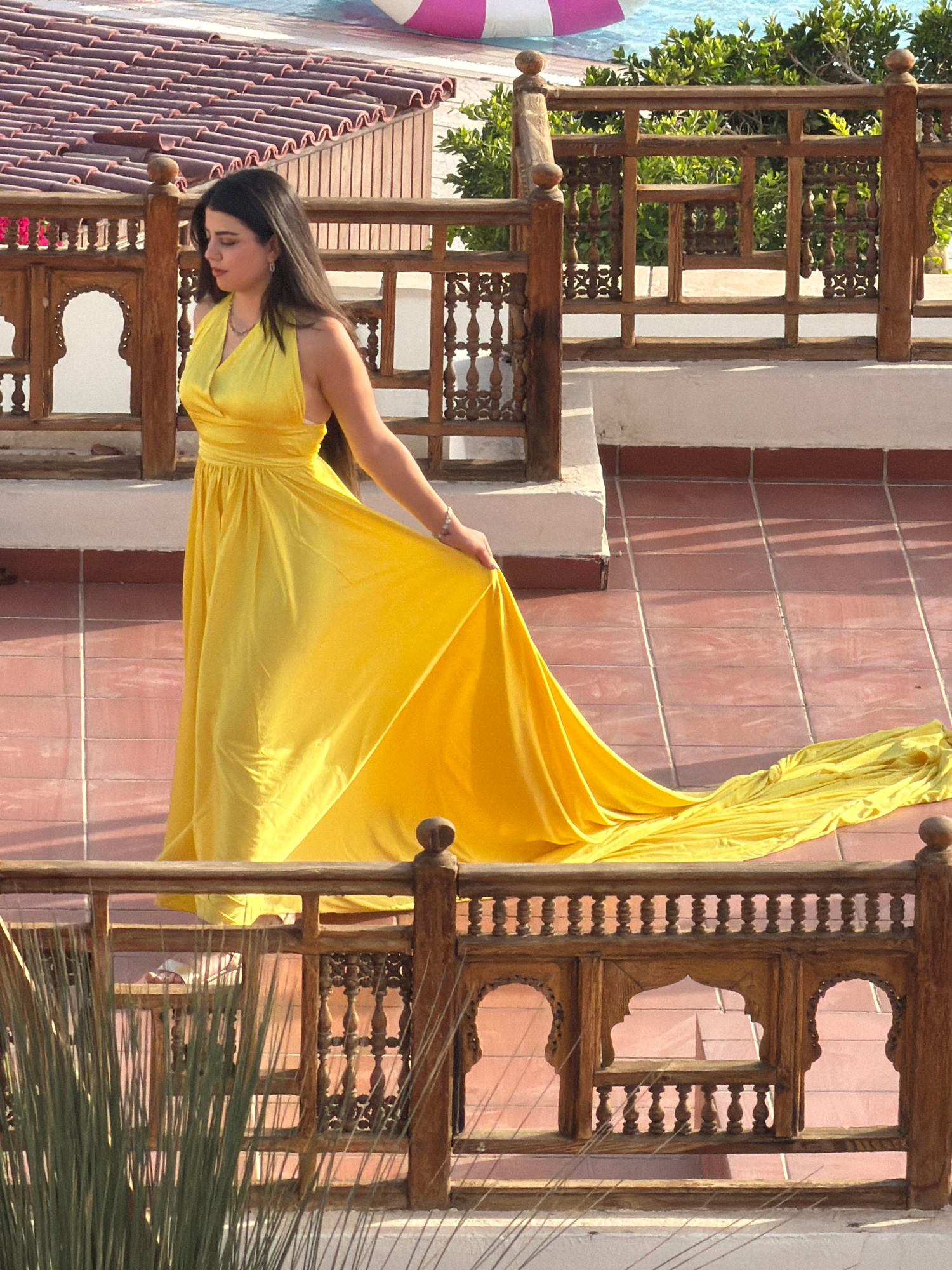 A young woman with long, dark hair, wearing a vibrant, flowing yellow maxi dress, is depicted outdoors. She is shown in a graceful pose, looking downwards, with her right hand gently holding up a sect…read more