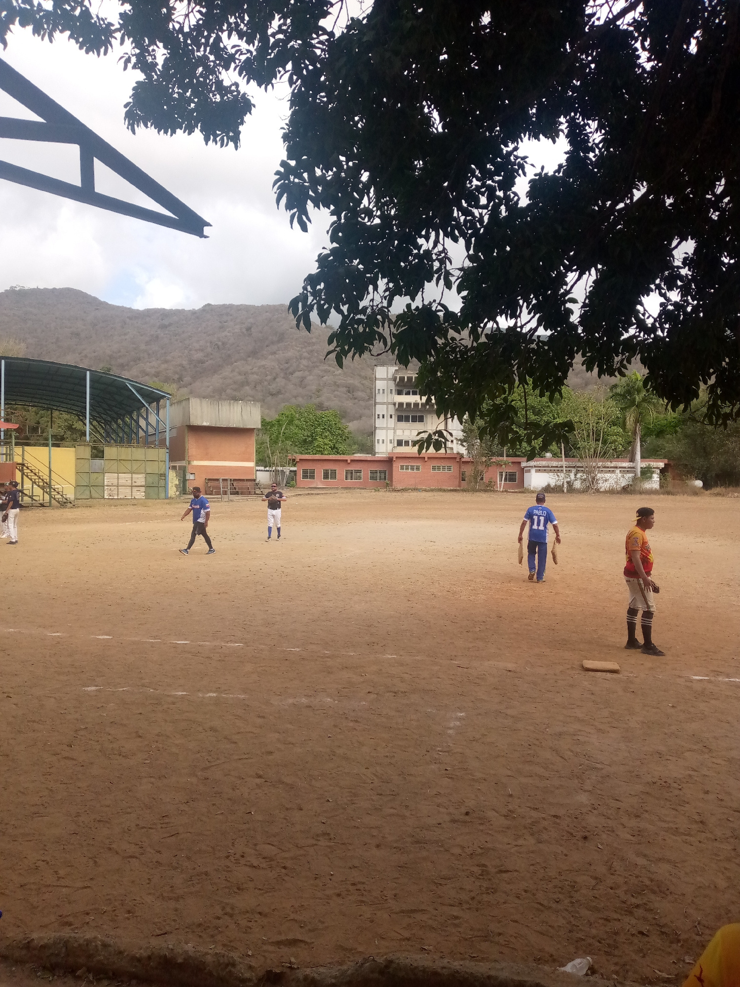 The image shows a baseball field in Las Piedras, Venezuela. The field is mostly dirt with some sparse grass. There are five men on the field, four of whom are wearing baseball uniforms. One man is wea…read more