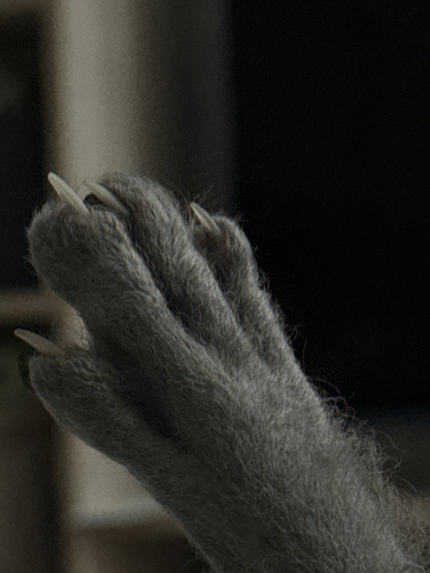 A close-up shot shows a grey, furry animal paw with sharp, extended claws. The background is blurred and shows dark and light shades. There are no other subjects present in the image. There is no infoβ¦read more