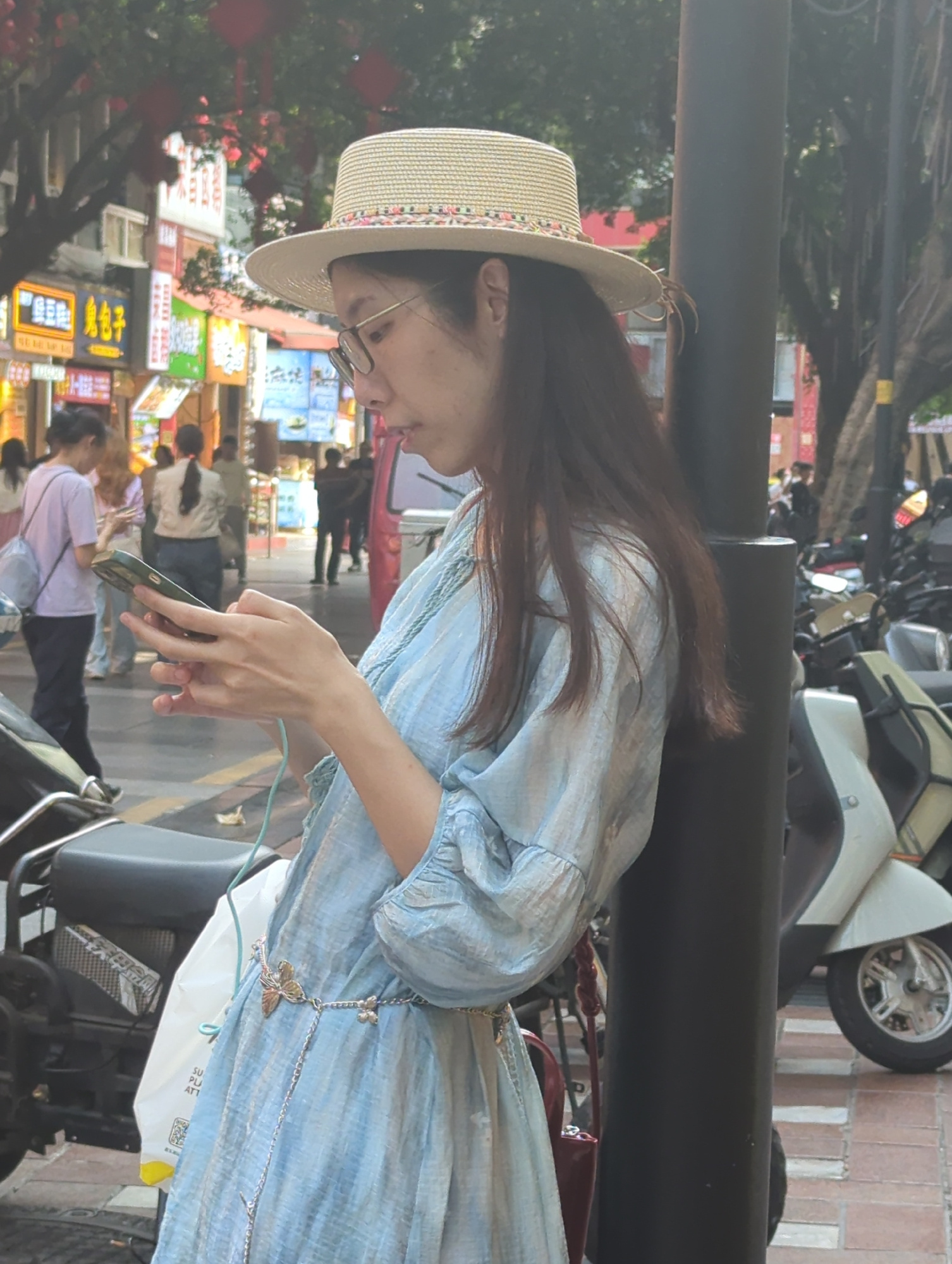 A young woman is captured in a side profile on a bustling street, looking down intently at her smartphone. She is wearing a light blue, flowing dress with puffed sleeves and a wide-brimmed straw hat a…read more