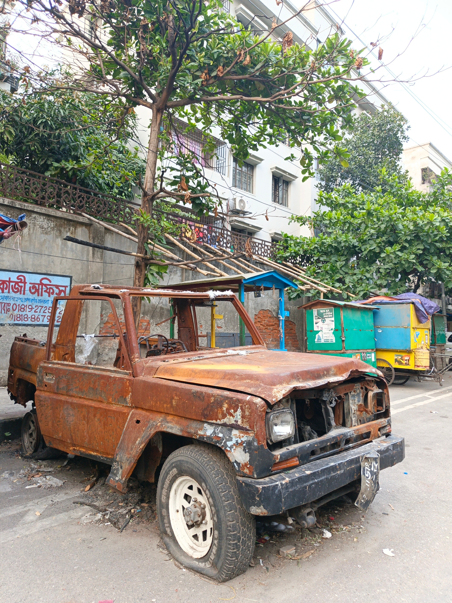 The image shows a heavily rusted and dilapidated pickup truck parked on a street in Dhaka, Bangladesh. The truck is missing most of its body panels, windows, and interior components, and it is covered…read more