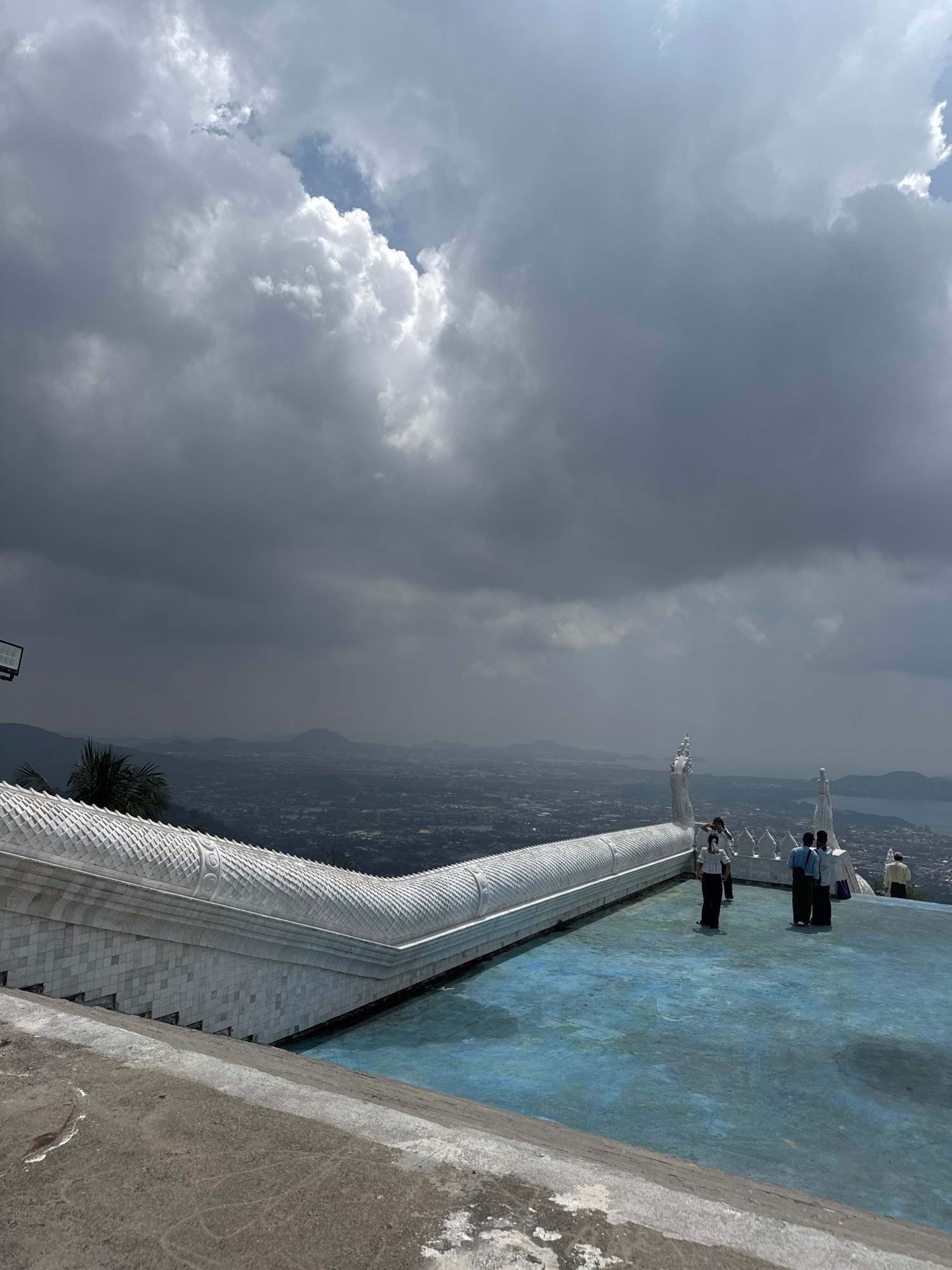 The image depicts a high-angle view from a temple structure in Karon, Thailand. Four people are standing near the edge of the structure, observing the landscape below. The structure features white rai…read more