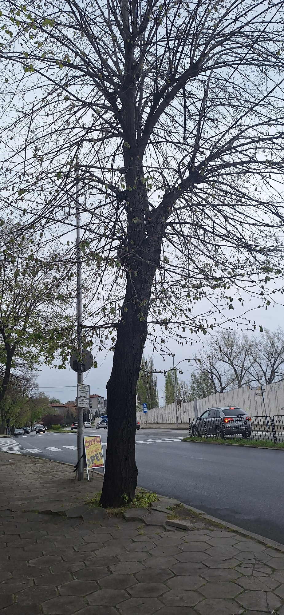 The image shows a street scene in what appears to be Blagoevgrad, Bulgaria. A large tree, mostly bare, occupies the left side of the frame, its trunk running horizontally. Some small green buds are vi…read more