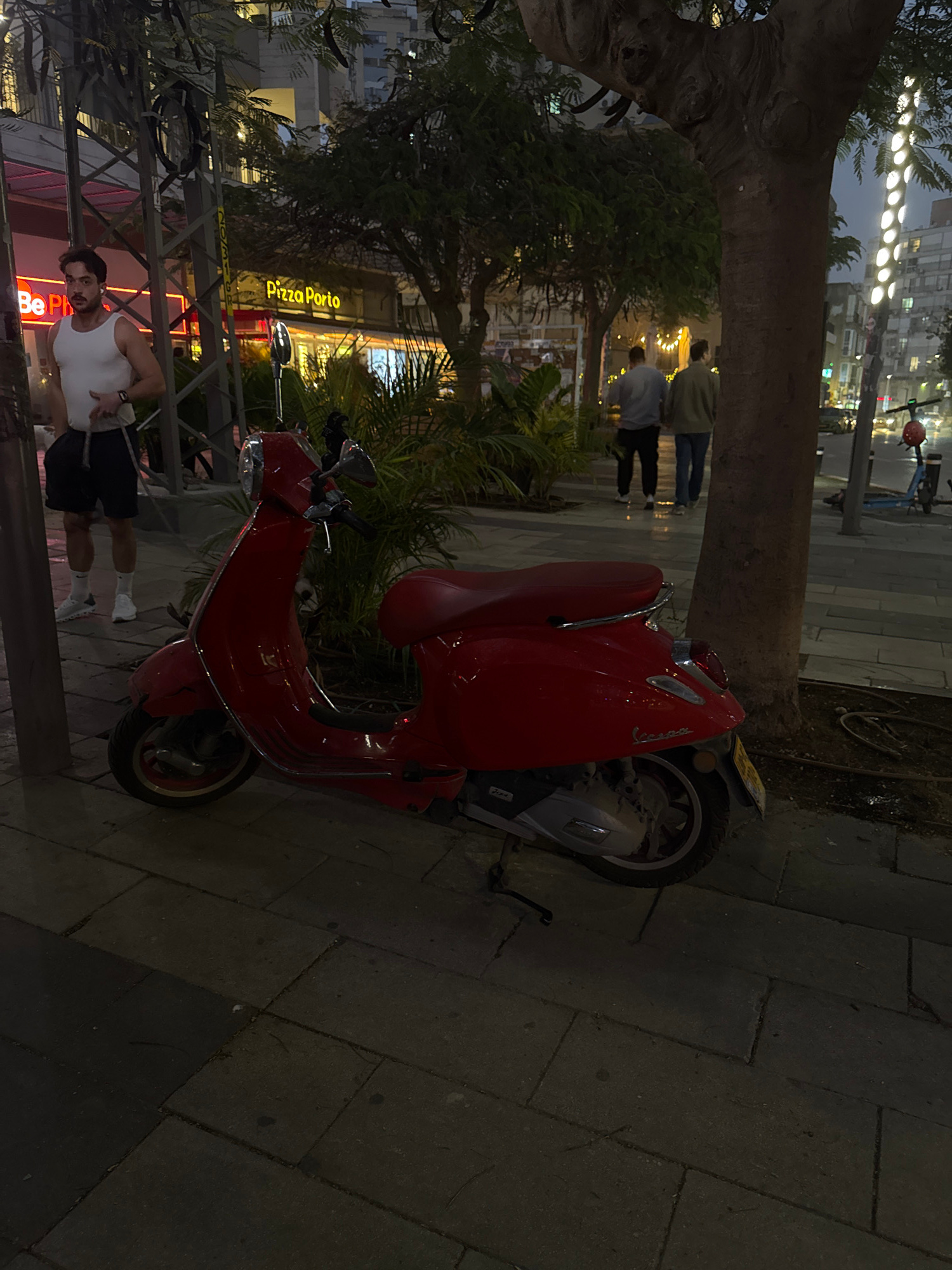The image captures a nighttime scene in Givatayim, Israel. A red scooter is prominently featured, parked on a paved surface next to a tree. In the background, there are pedestrians walking. A man in a…read more