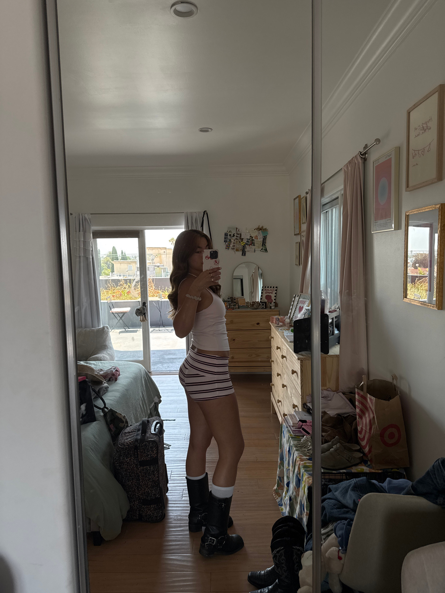 A reflection in a closet mirror shows a person wearing a striped outfit, white socks, and black boots standing in what appears to be a bedroom. The person is holding a phone and taking a picture of th…read more
