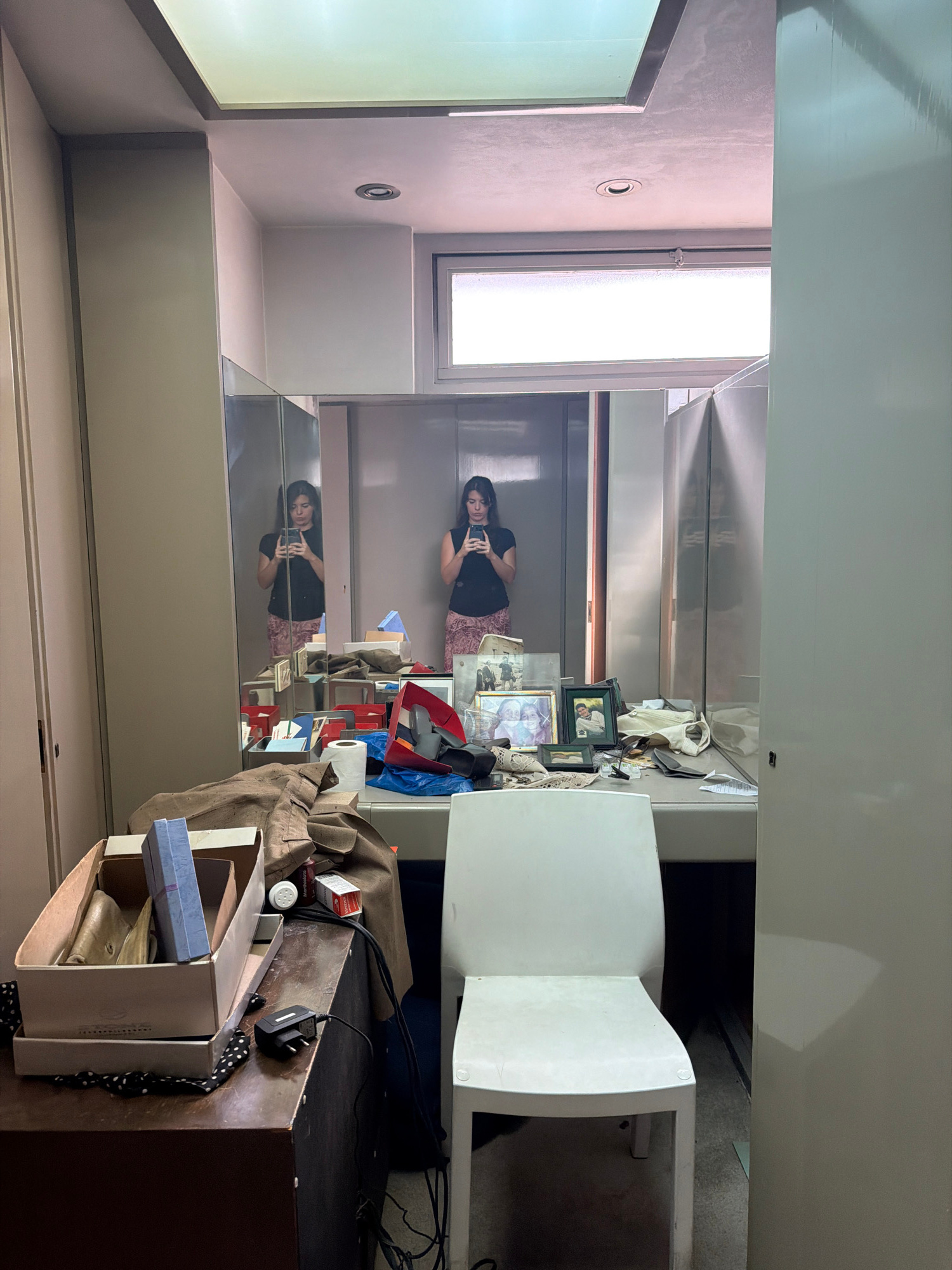 A woman takes a selfie in a narrow room with a mirror reflecting her and the cluttered space. The room is filled with various objects, including boxes, chairs, and picture frames. The setting appears…read more