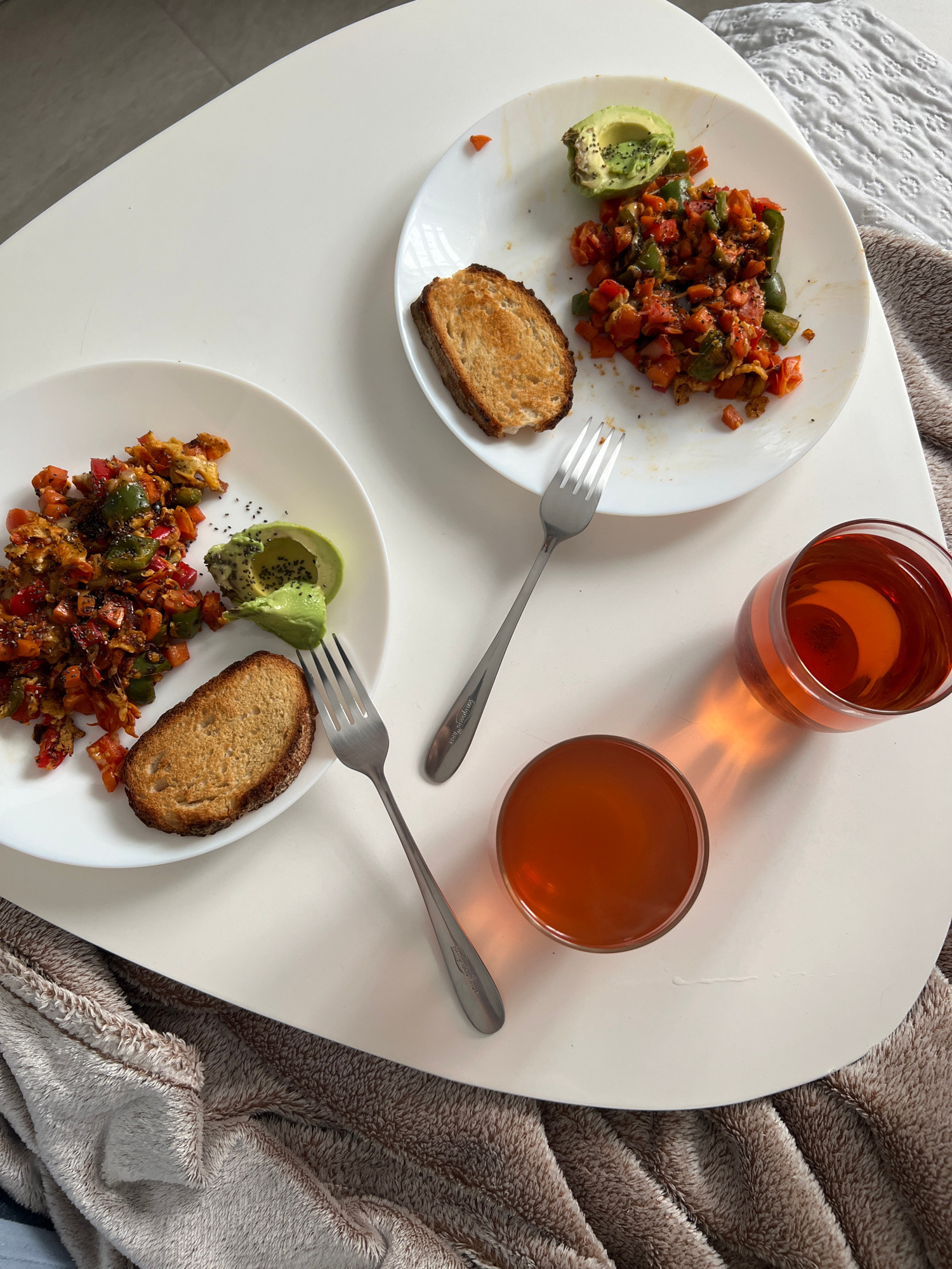 Two plates of food, two glasses of liquid, and two forks rest on a small white table. Each plate contains a portion of vegetable hash, a half avocado with seeds, and a slice of toast. The glasses appear to contain a light-colored beverage. A light-colored blanket is partially visible in the background. The image was likely taken indoors. There is no indication that the photo was taken in Mogán, Spain. | Open Wire