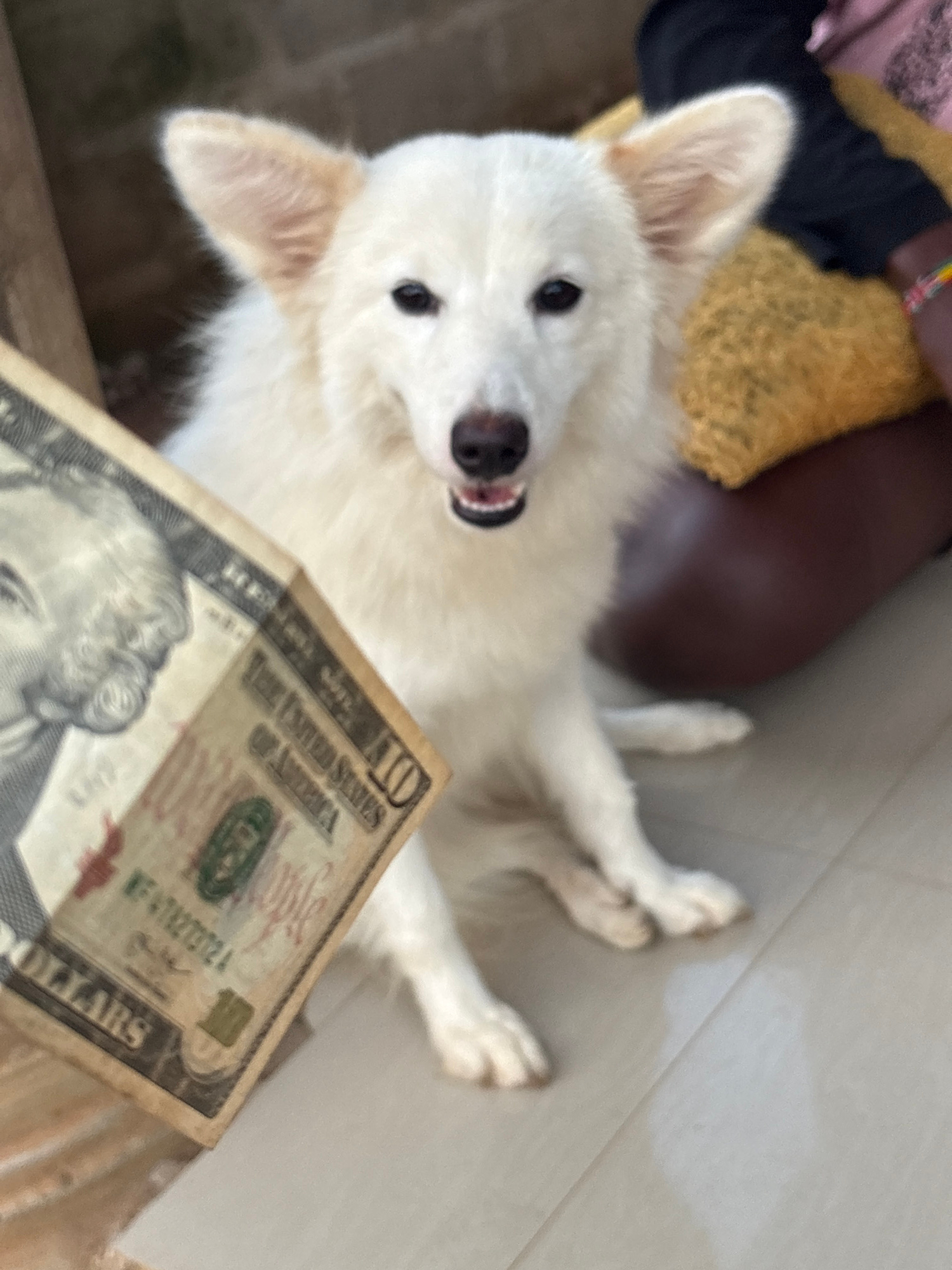 A white dog lies on its back with its paws in the air. A ten-dollar bill partially covers the dog. The location is Ikot Ekpene, Nigeria.