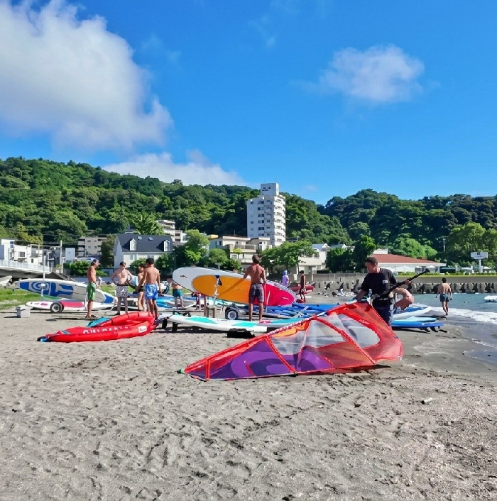 The image depicts a coastal beach scene in Mitoyo, Japan, under a clear blue sky with scattered white clouds. The foreground consists of dark grey sand, populated by approximately 10-15 individuals, mostly adult males in swim trunks or bare-chested. They are engaged with various watersports equipment. A prominent red, purple, and pink windsurfing sail lies partially assembled on the sand in the lower right foreground. Nearby, multiple paddleboards and windsurfing boards are staged on the sand and on small trailers. One male figure in a black t-shirt stands near the water's edge, holding a windsurfing boom and mast assembly. The water, visible to the right, is calm and dark blue, with a concrete or stone seawall bordering the beach further down. The background features densely forested green hills. Between the hills and the beach, several buildings are visible, including a multi-story white structure and various residential-style buildings. The overall scene suggests a gathering for watersports activities. | Open Wire