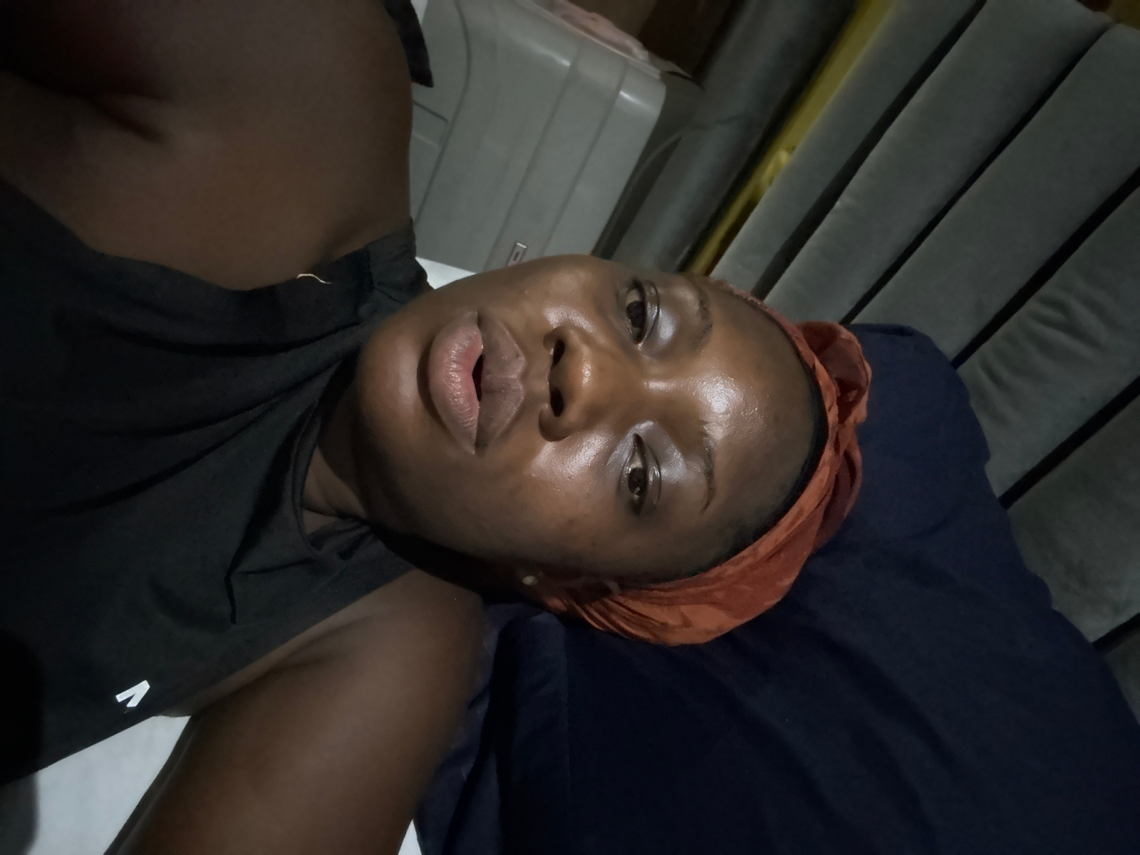 The image shows a person with brown skin and an orange headscarf. The person is wearing a black t-shirt with a white logo. The background consists of a blue cushion and a gray ribbed surface. The loca…read more